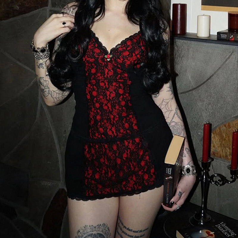 Top camisole sexy à col en V, dentelle gothique foncée, à empiècements, motif floral, couleur contrastée, coupe ajustée, petit gilet pour filles sexy