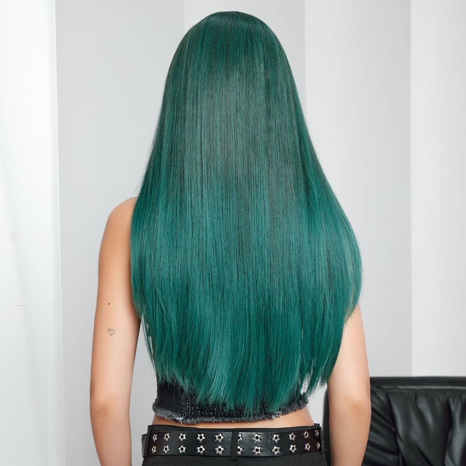 Perruque synthétique vert foncé citron vert droite longue avec une frange lisse perruque en fibres chimiques mates pour les femmes coupe de cheveux moyenne