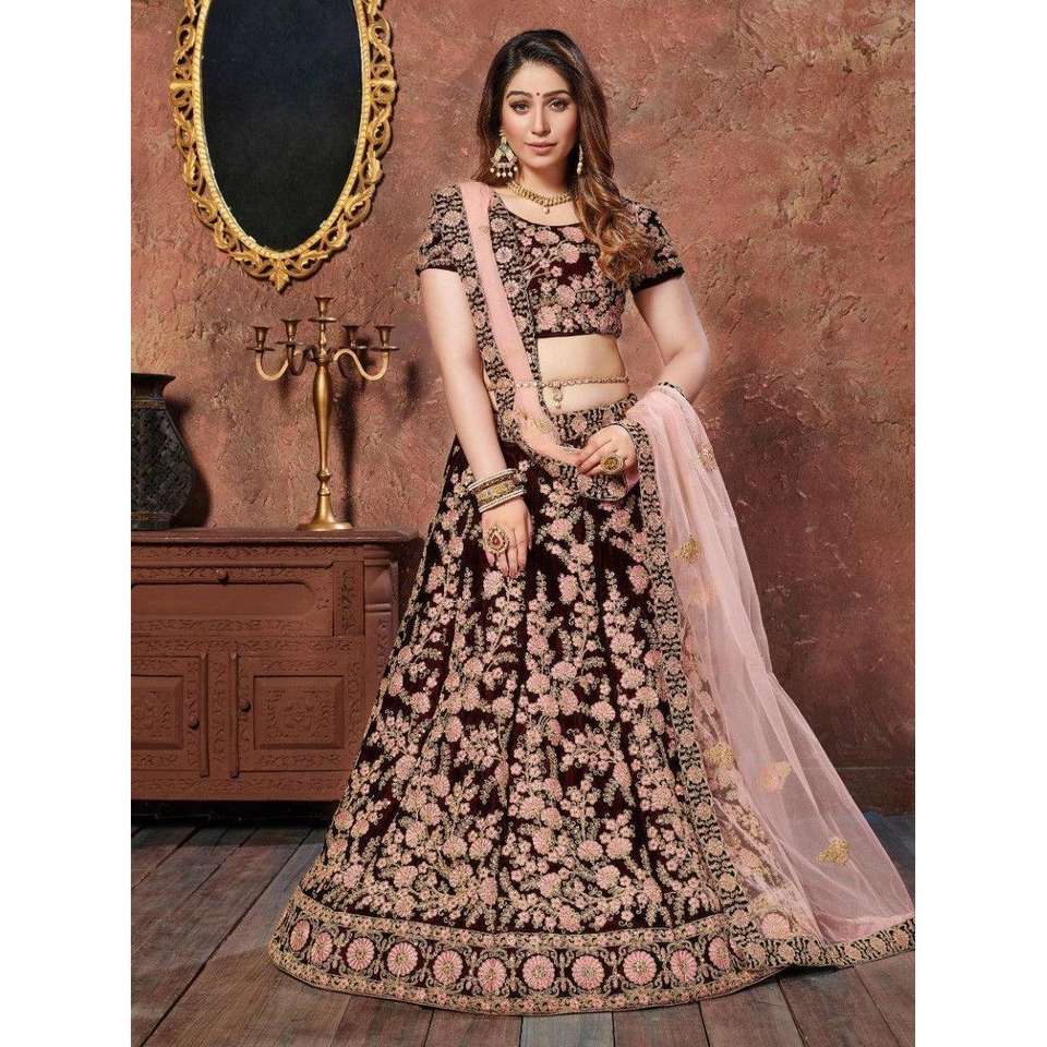 Lehenga Choli Velours en soie brodé de fil marron foncé