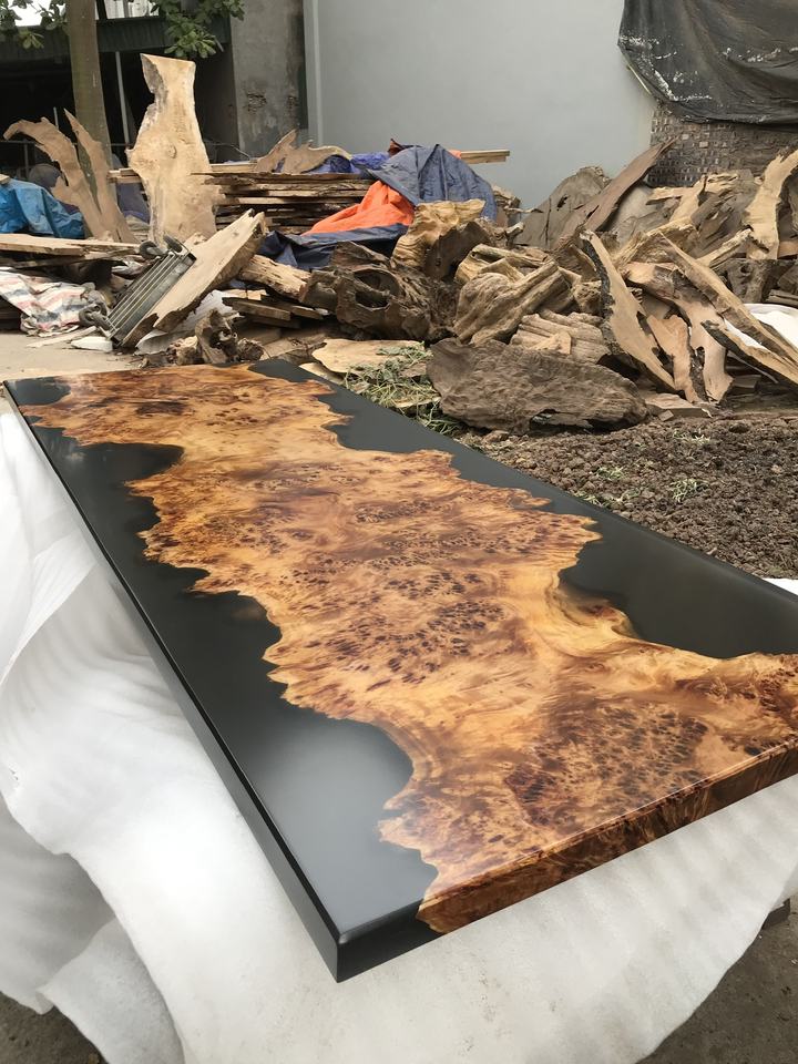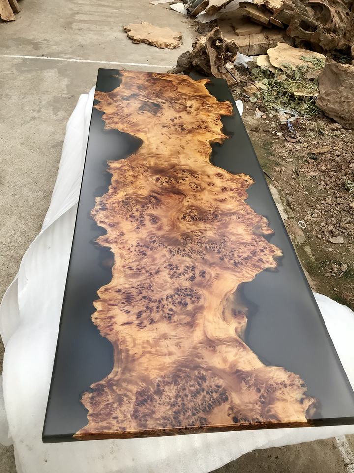 Table à manger en bois naturel de style sombre avec plateau en résine époxy, Nouveauté 2026, Prix abordable, Offre exceptionnelle, Meubles
