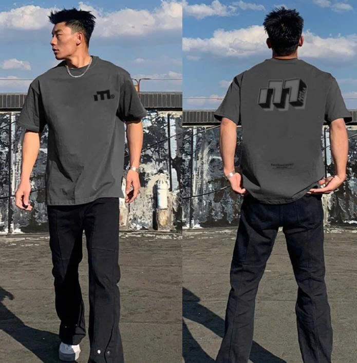 Dark gray men's fashion t-shirt, loose basic t-shirt with graphic print, short-sleeved t-shirt.