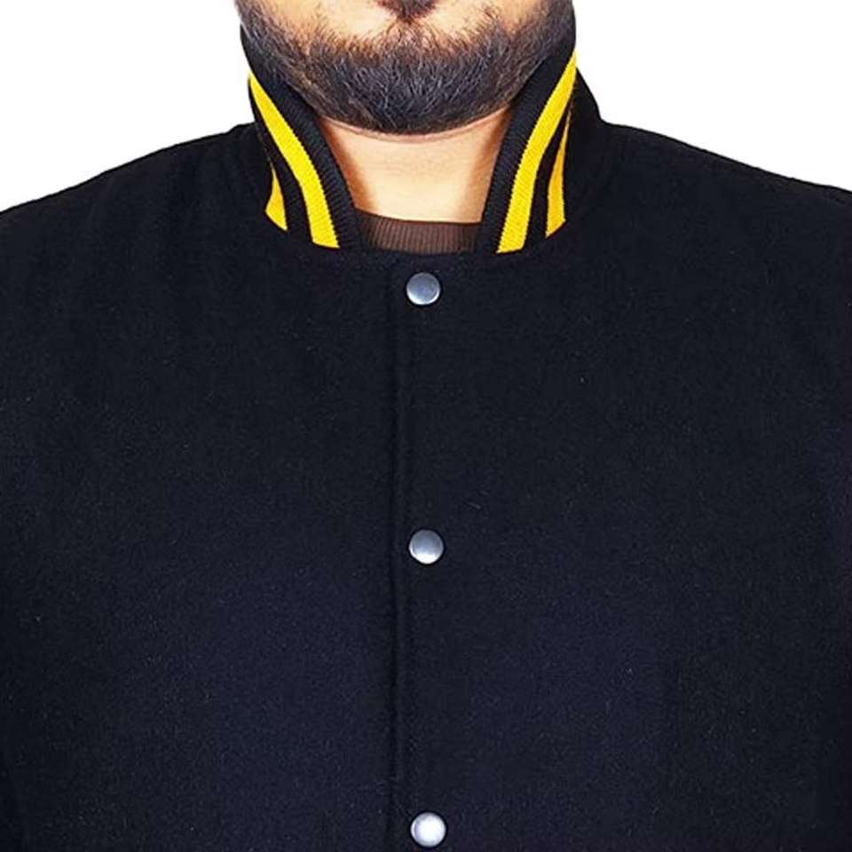 Dark varsity jacket with grey sleeves mens unisex baseball style button up rib trim custom logo option casual warm outerwear