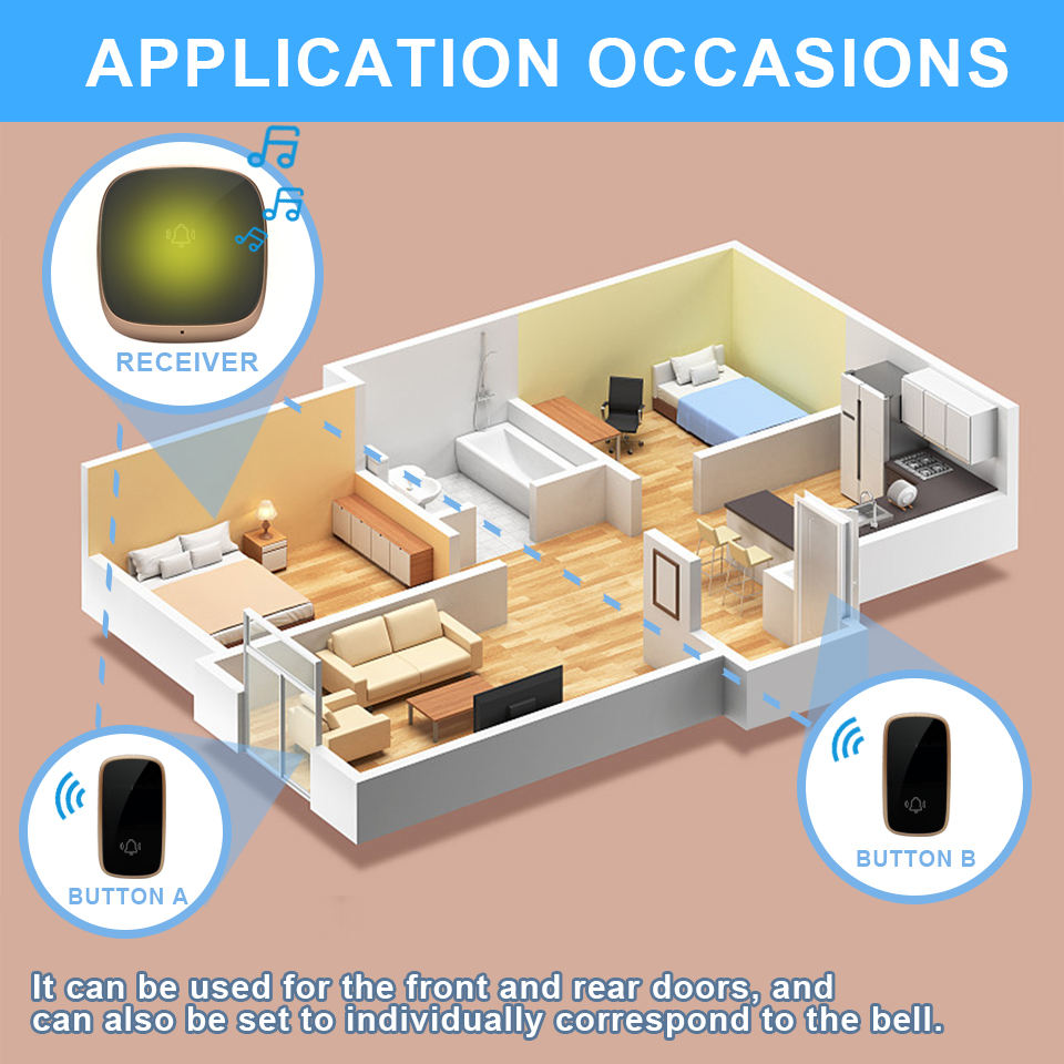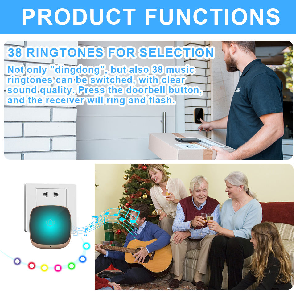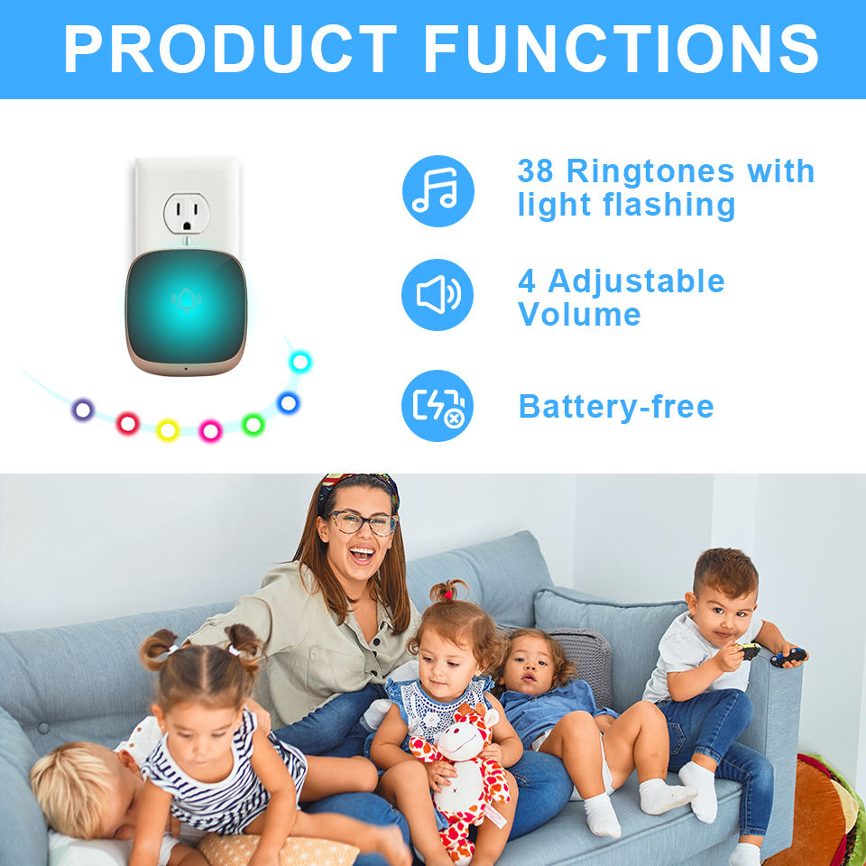 Sonnette sans fil personnalisable Daytech, étanche IP44, volume réglable sur 4 niveaux, 38 sonneries, son 0-110 dB, respiration colorée