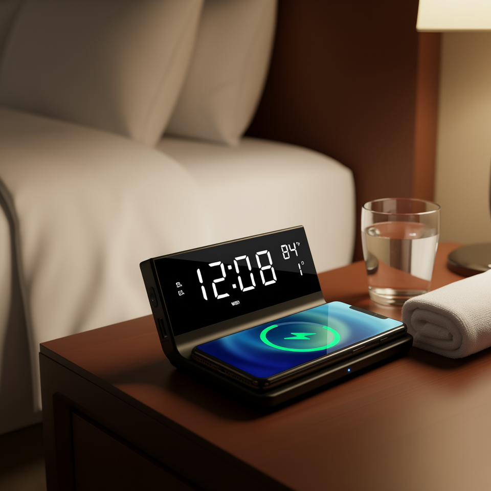 Réveil numérique double alarme avec chargeur sans fil et radio FM pour hôtels