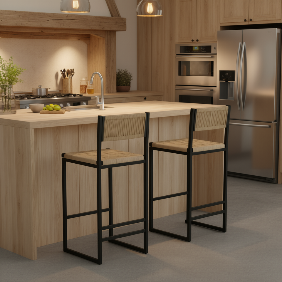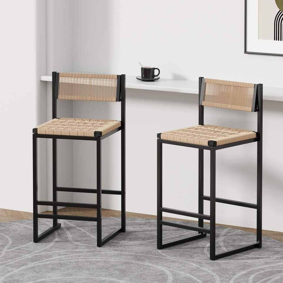 Tabourets de bar Db Kitchen, ensemble de 2, en corde tressée, hauteur de comptoir, noir, style farmhouse, structure métallique