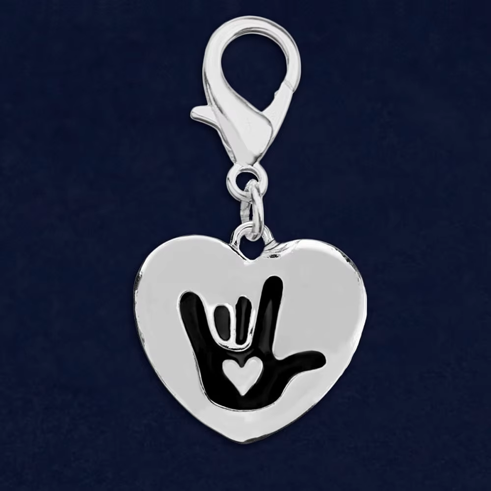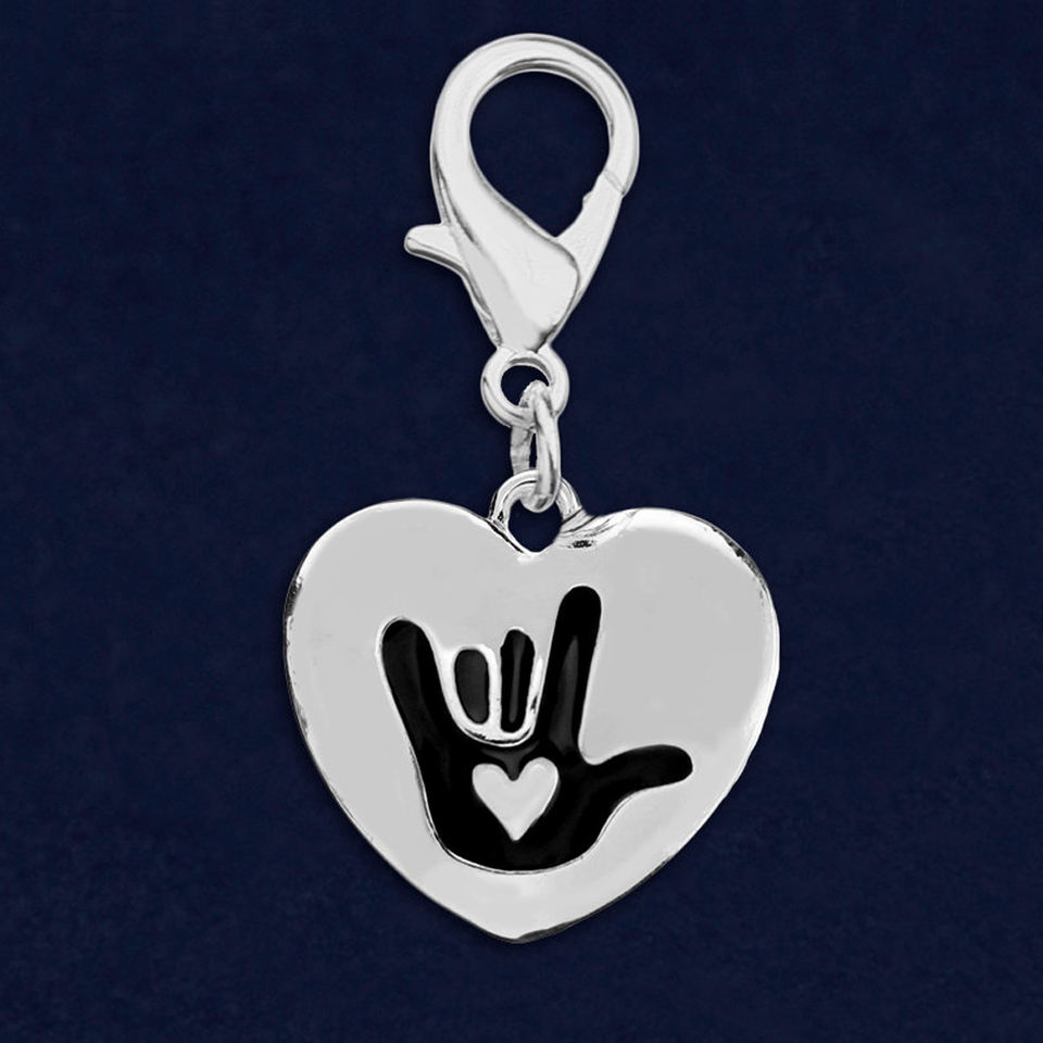 Breloque en forme de cœur, symbole "je t'aime", couleur argent, noir, symbole en émail, pa