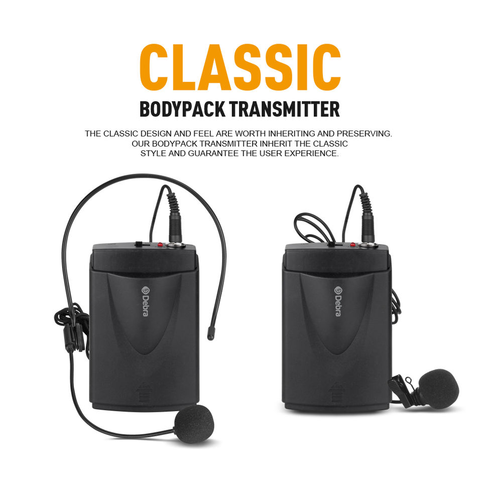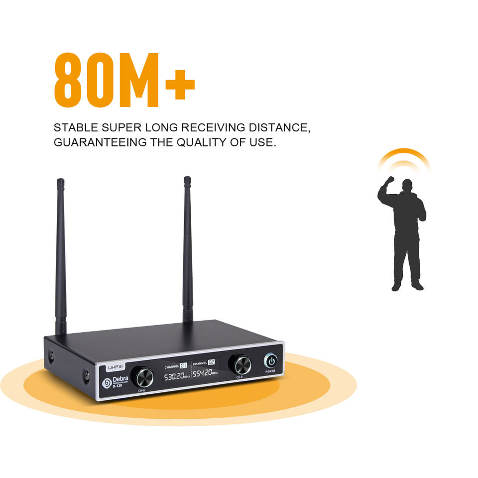 Système de microphone sans fil UHF Debra Audio D-120, micro-casque/micro-cravate, réduction de bruit, lumières LED, métal, OEM, KTV