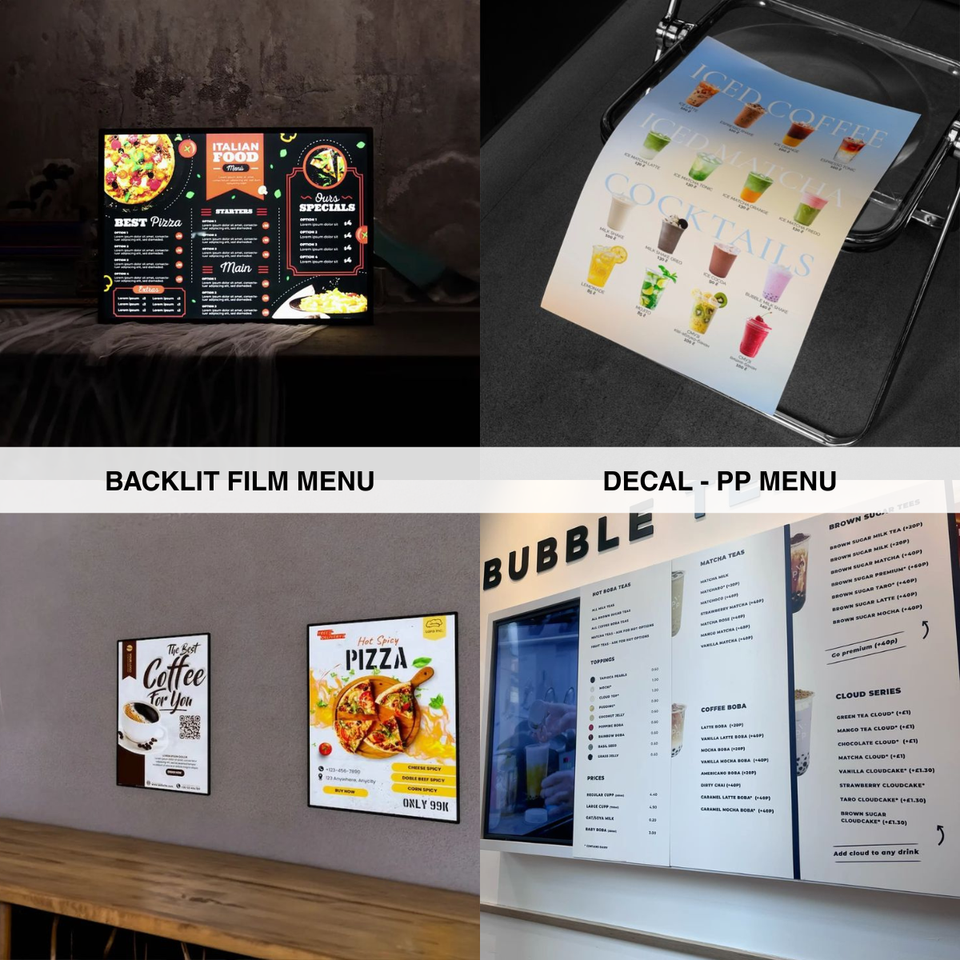 Autocollants en PP et films rétroéclairés, menus personnalisés avec impression couleur pour cafés, restaurants et bars commerciaux