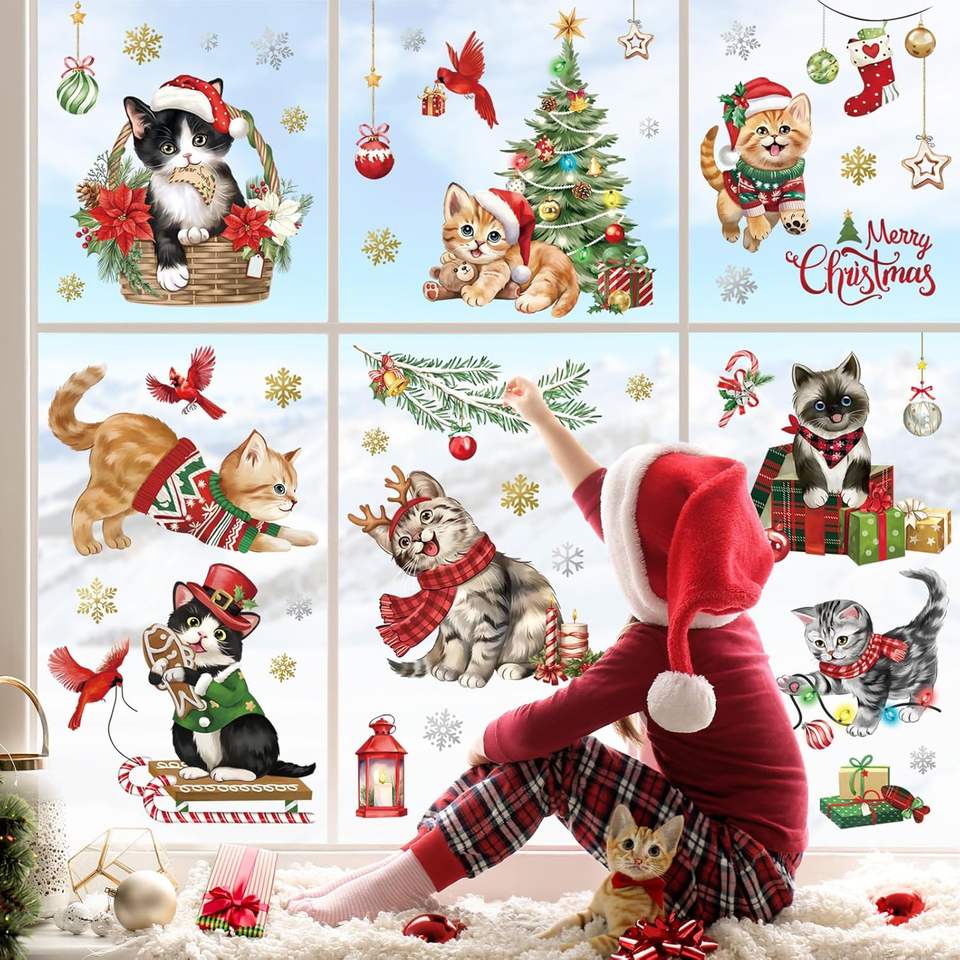 Autocollants de fenêtre réutilisables Decalmile imprimés recto-verso, motif de chatons de Noël, oiseaux cardinaux, pour la décoration de verre
