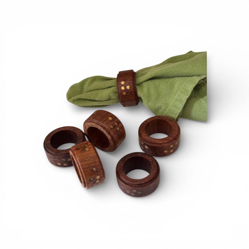Ensemble d'anneaux de serviette en bois décoratifs avec motif à pois en laiton pour un accent de table rustique de luxe unique