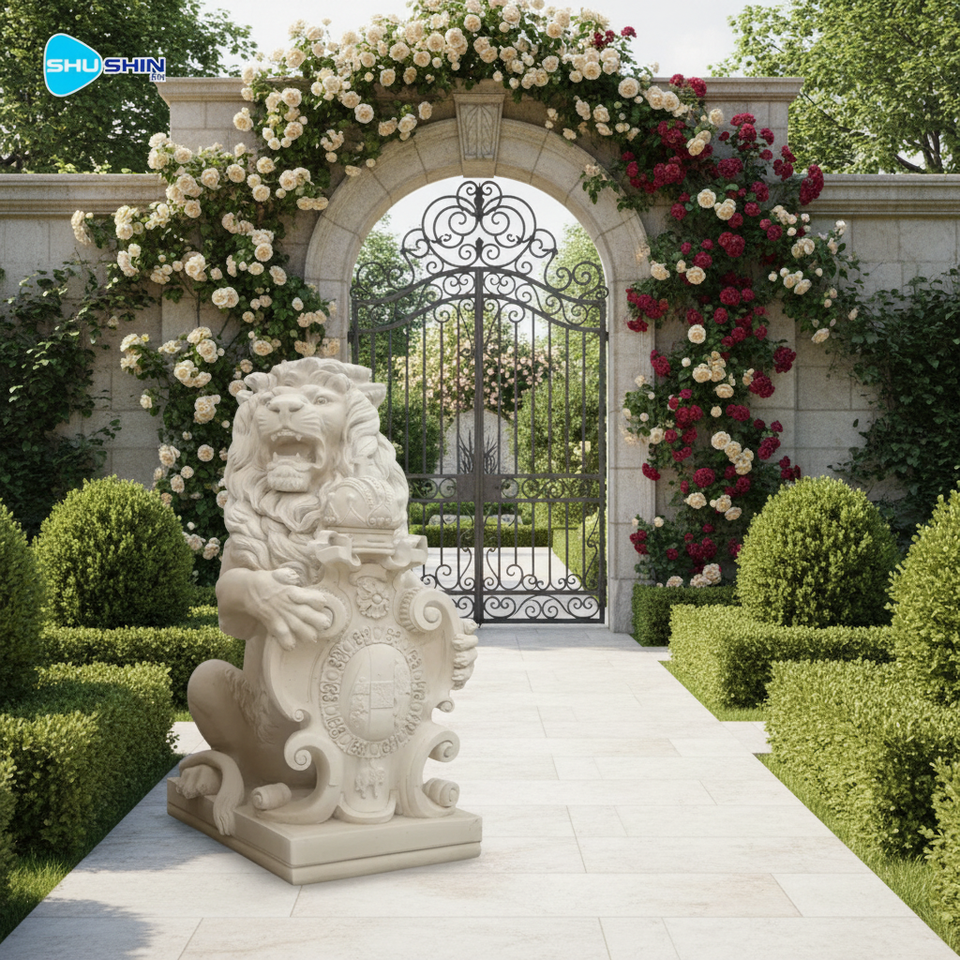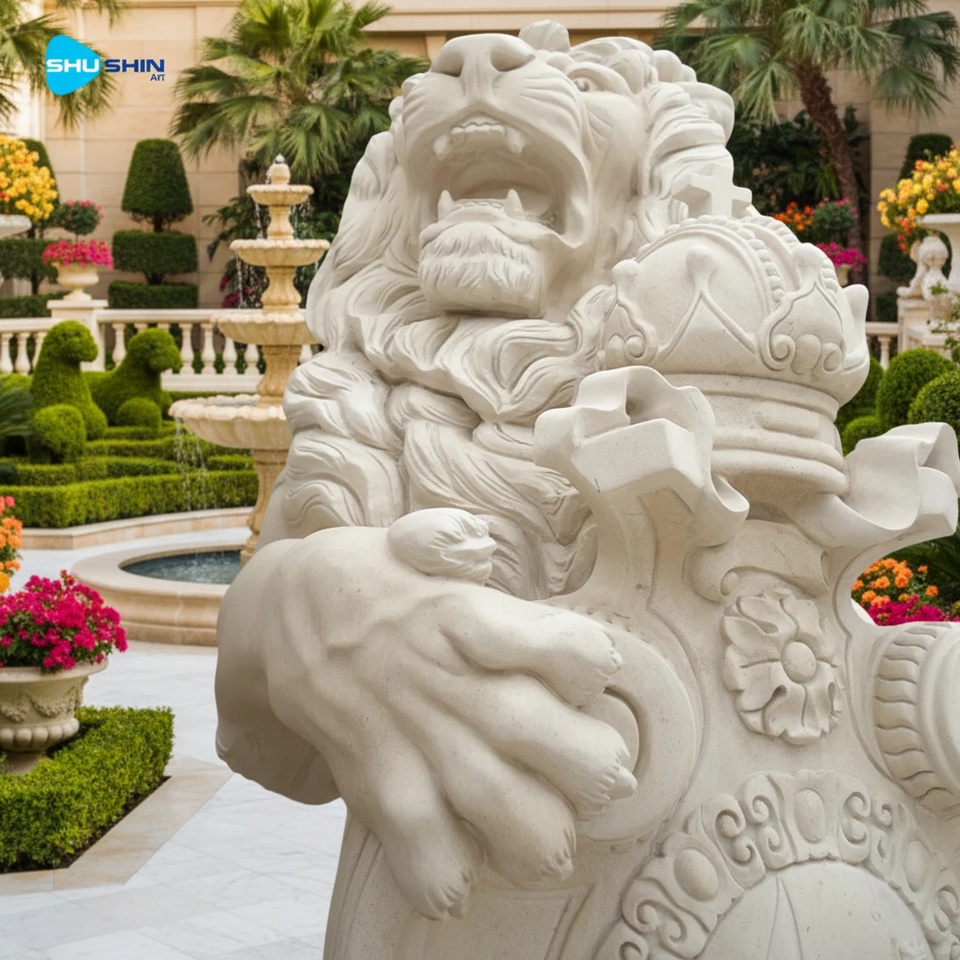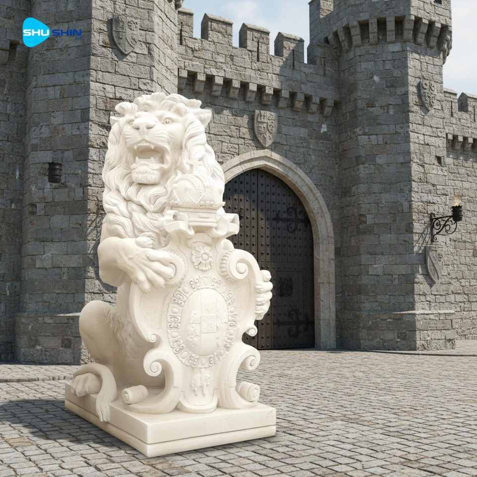 Lion en marbre décoratif avec bouclier et armoiries pour jardin extérieur et entrée d'église, design européen, fait main, garantie 5 ans