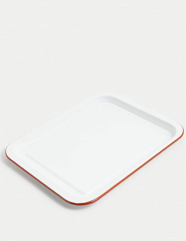 Plateau de service décoratif en métal avec finition émaillée durable, parfait pour présenter des fruits, des bonbons, des collations ou des boissons