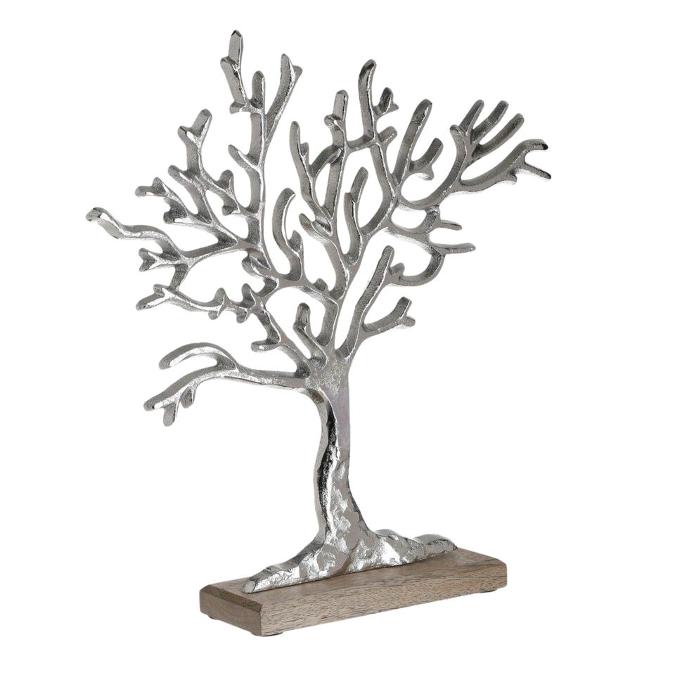 Arbre décoratif au design minimaliste avec base en bois, en aluminium plaqué argent, ornement pour cadeau, décoration de fêtes, idéal pour offrir.