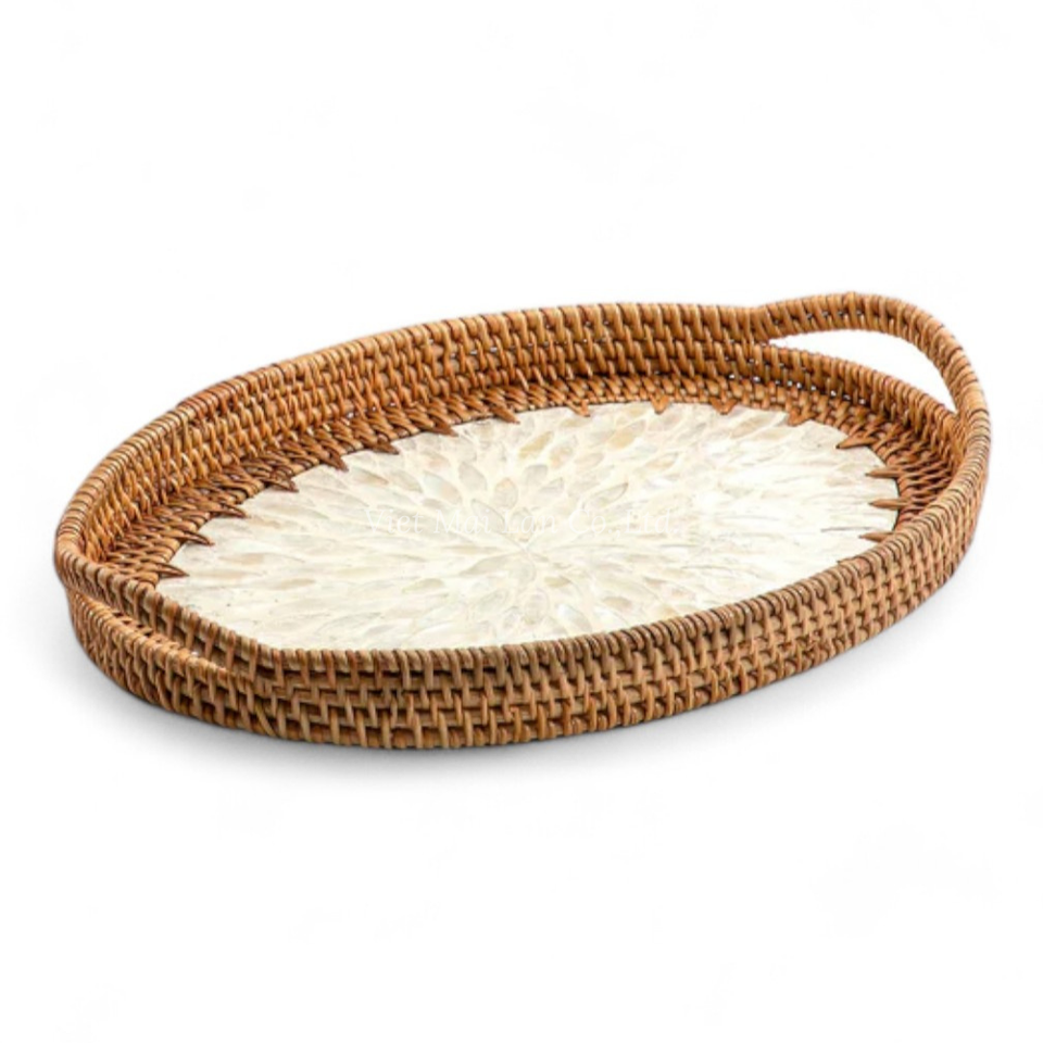 Plateau ovale décoratif en rotin avec incrustation de nacre, approvisionnement en gros, vaisselle pour restaurants et hôtels