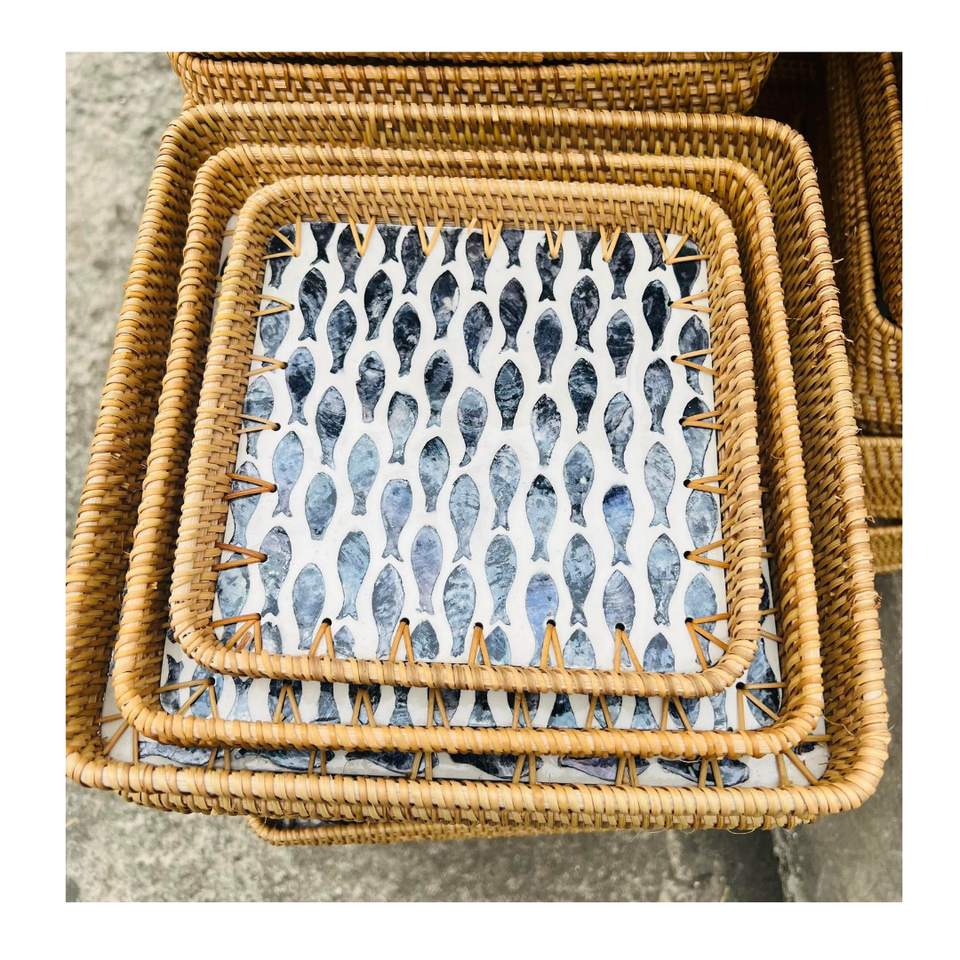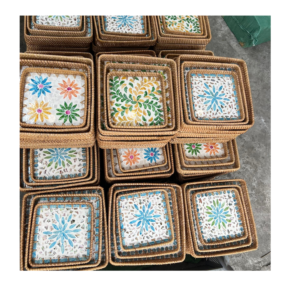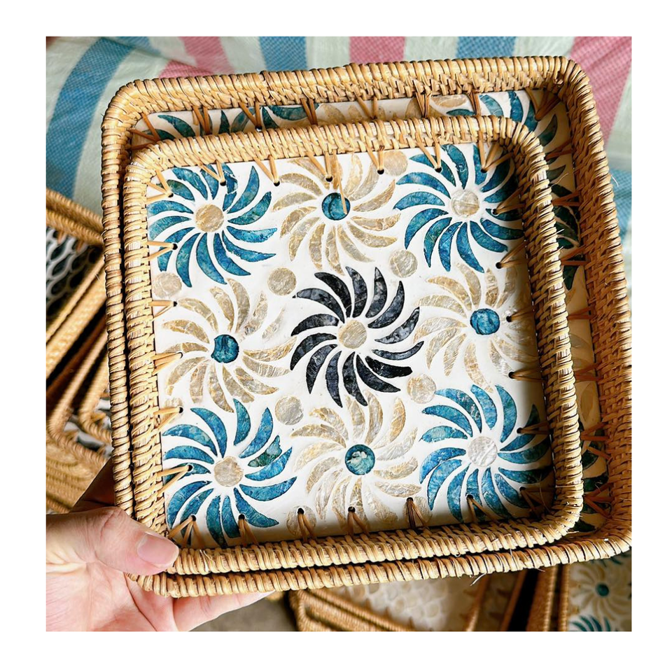 Plateau de service décoratif en rotin avec incrustation de nacre, fait à la main, décoration naturelle pour la maison