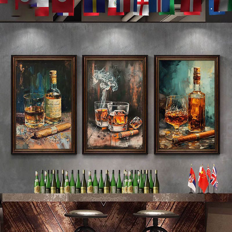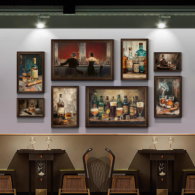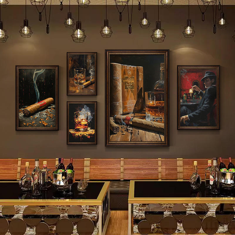 Peinture à l'huile décorative rétro nostalgique sur le thème de la musique, des bars, de la culture du vin, des cocktails, des spiritueux étrangers, du whisky et des cigares, encadrée et à suspendre
