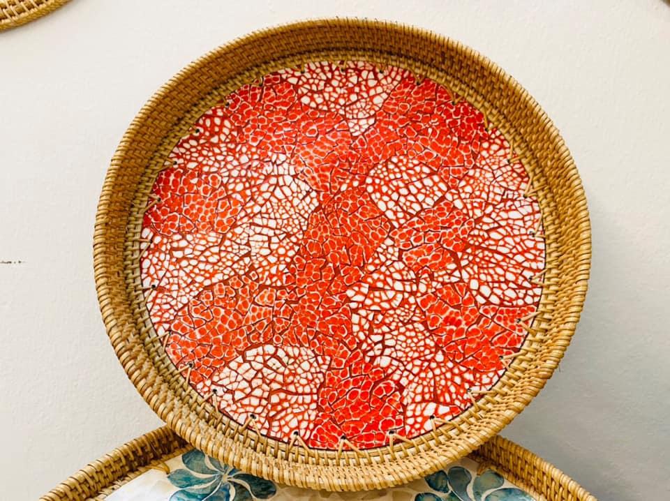 Plateau de service rond décoratif en rotin et nacre incrustée