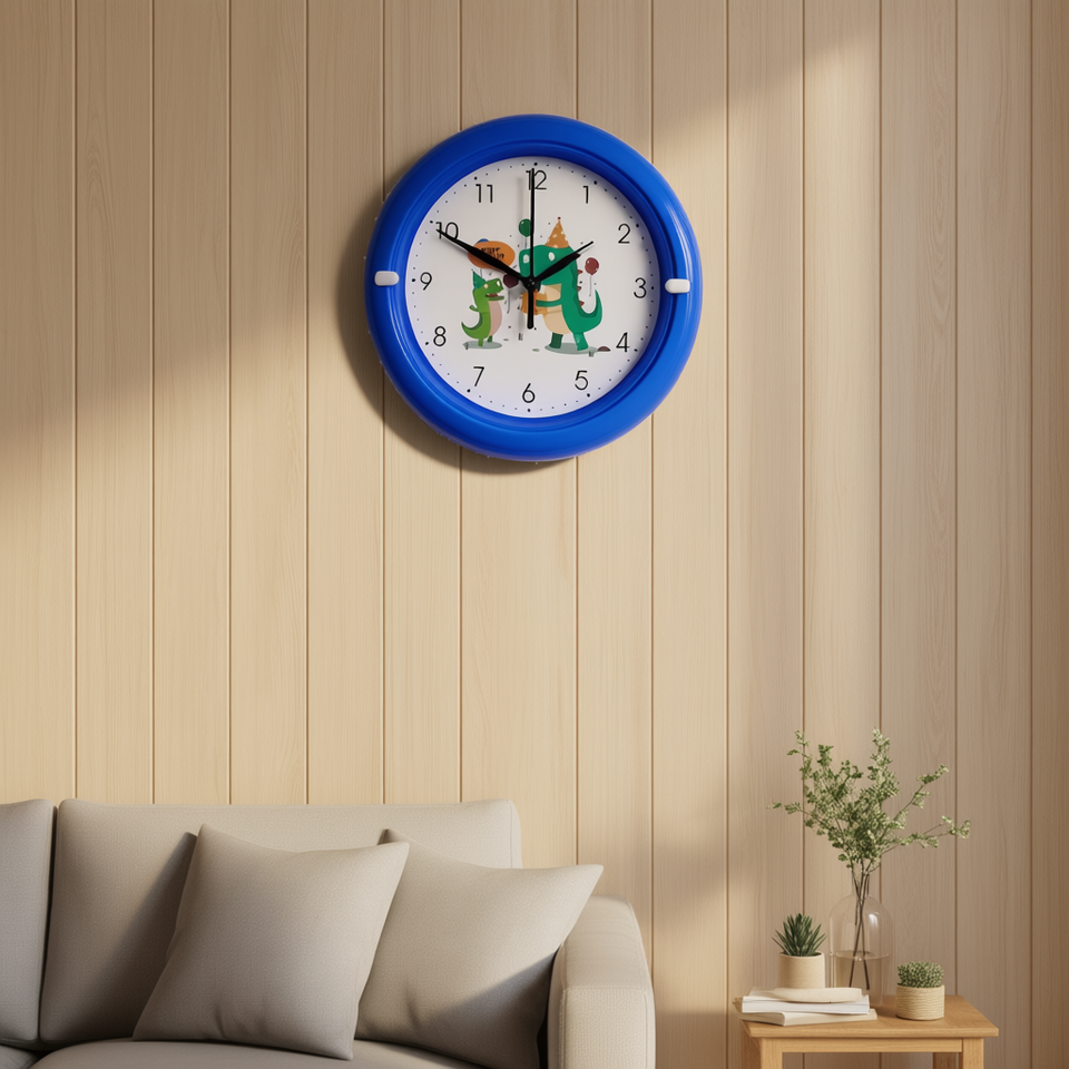Horloge murale électronique pour enfants, design de dinosaure de dessin animé, en plastique bleu, silencieuse, à quartz, analogique, pour décoration de chambre d'enfant, CL076