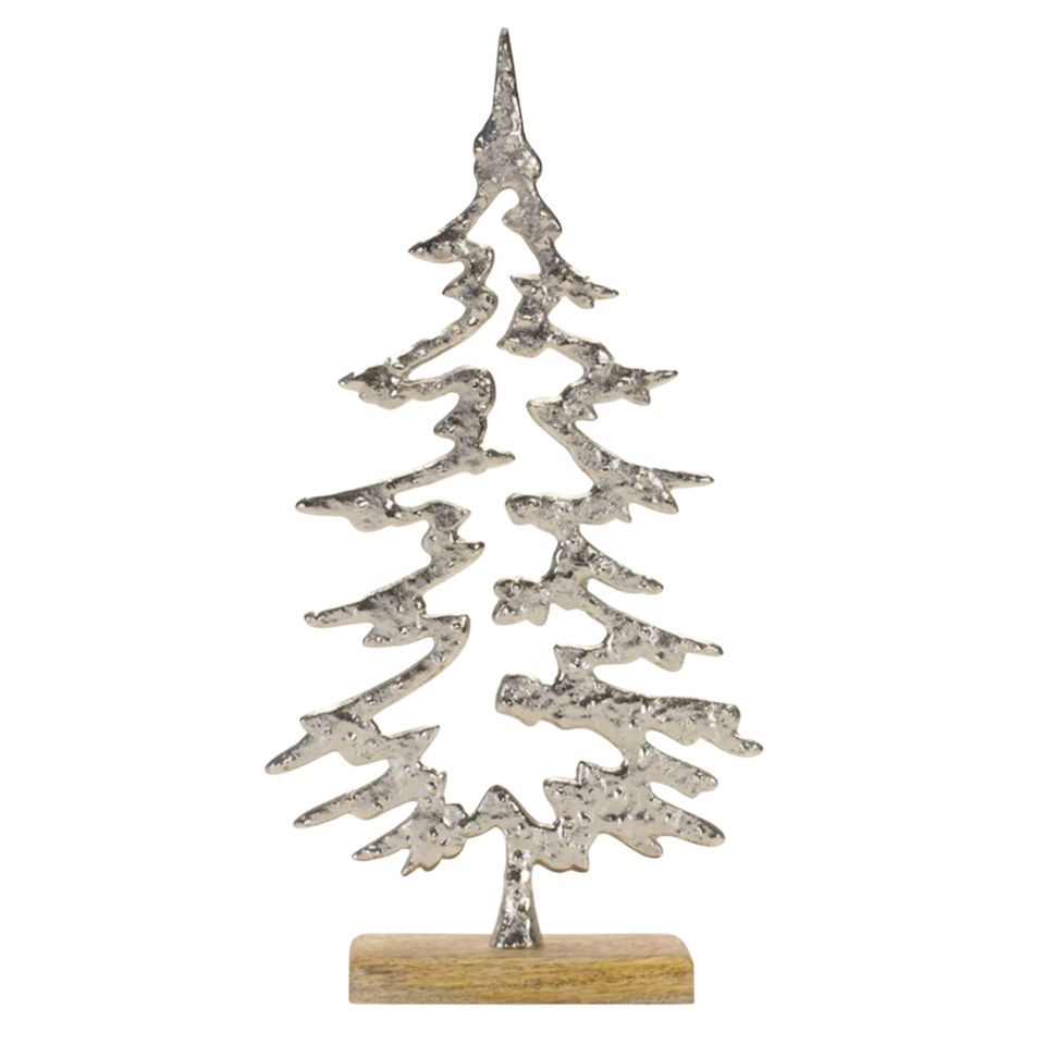 Arbre décoratif en forme d'arbre en aluminium plaqué argent avec base en bois pour la décoration, accent de présentoir pour l'aménagement intérieur