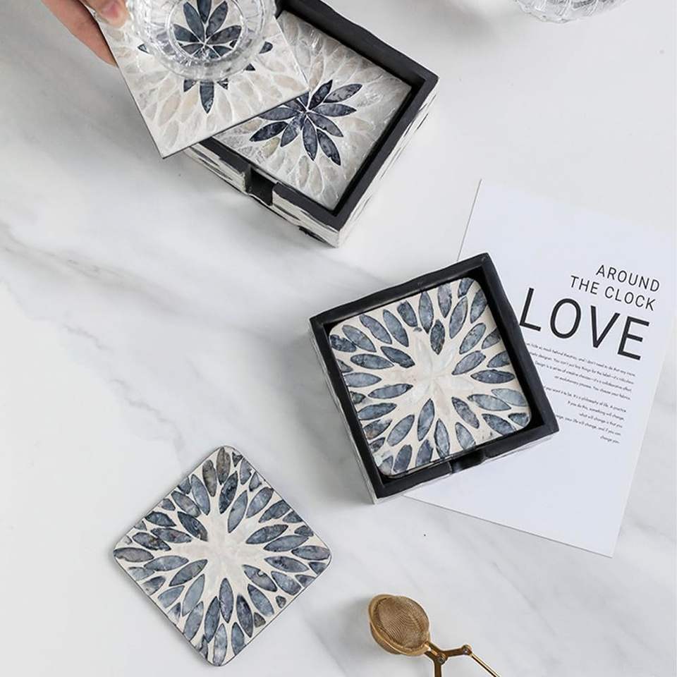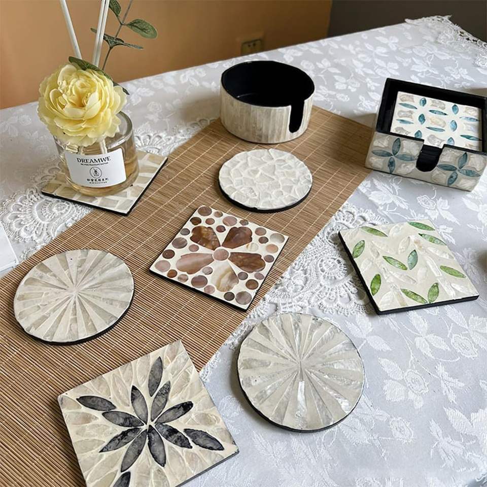 Decorative mother of pearl coaster set shell inlay square mosaic carved disc cup coasters with holder