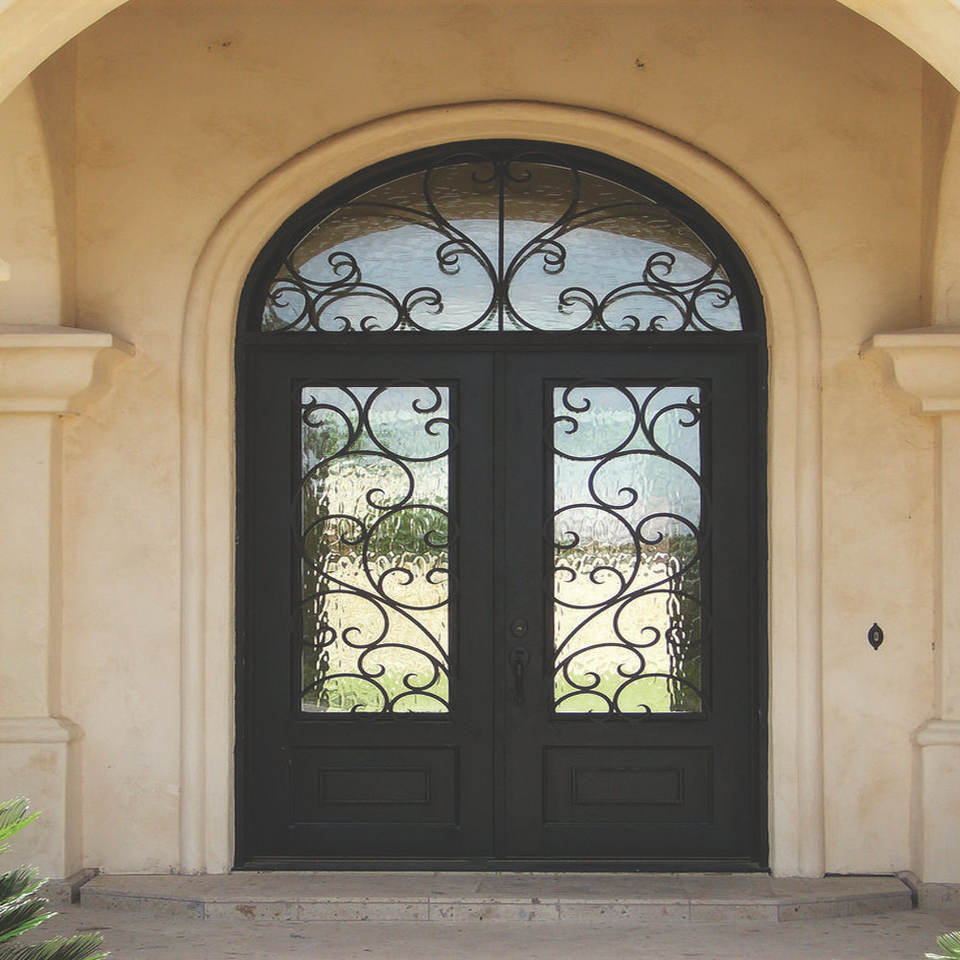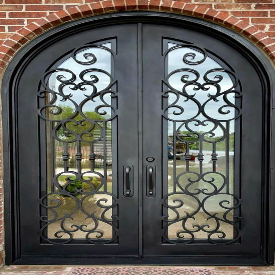 Decorative wrought iron door with curved silhouette and layered scroll design crafted in Vietnam for classic luxury homes