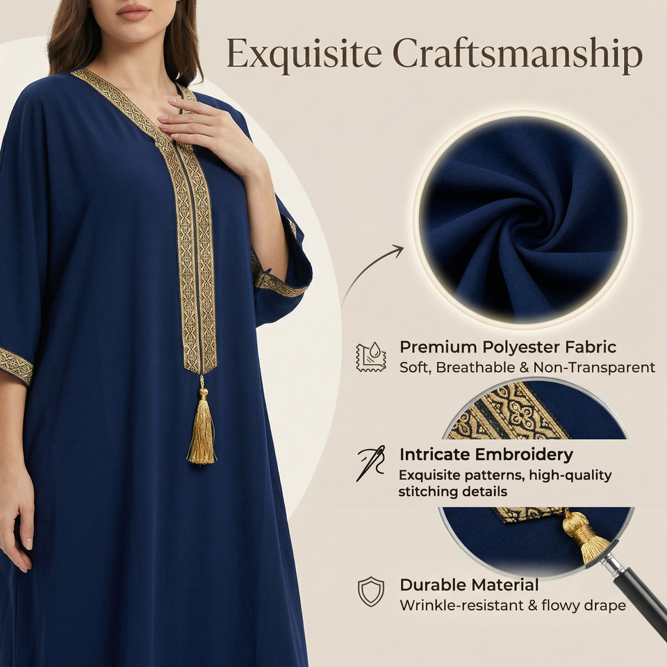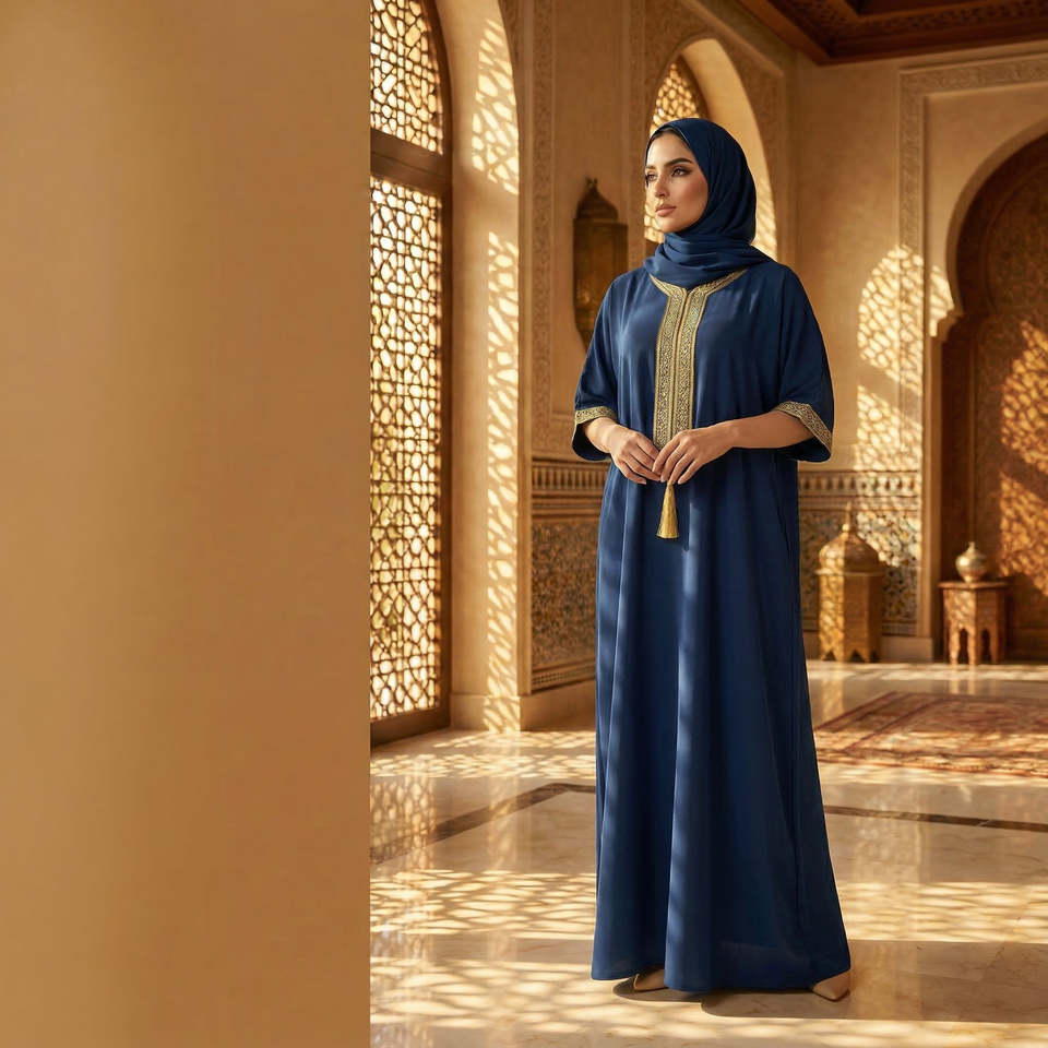 Caftan Deep Blue Devotion avec cordon à pompons pour la mosquée silencieuse