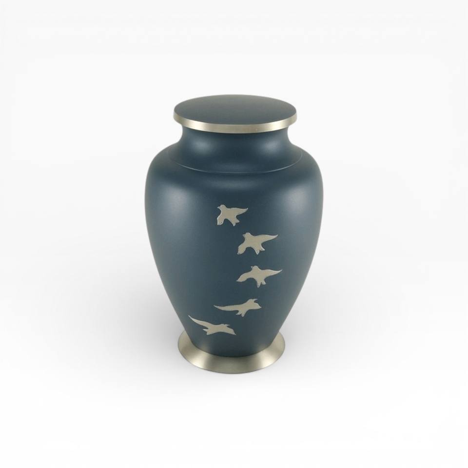 Urne funéraire bleu profond mat avec dessus argenté et forme haute et lisse pour un mémorial contemporain