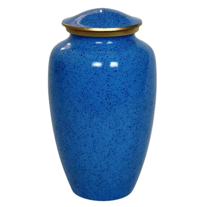 Urne funéraire texturée bleu profond avec finition mouchetée pour un contexte commémoratif classique et calme