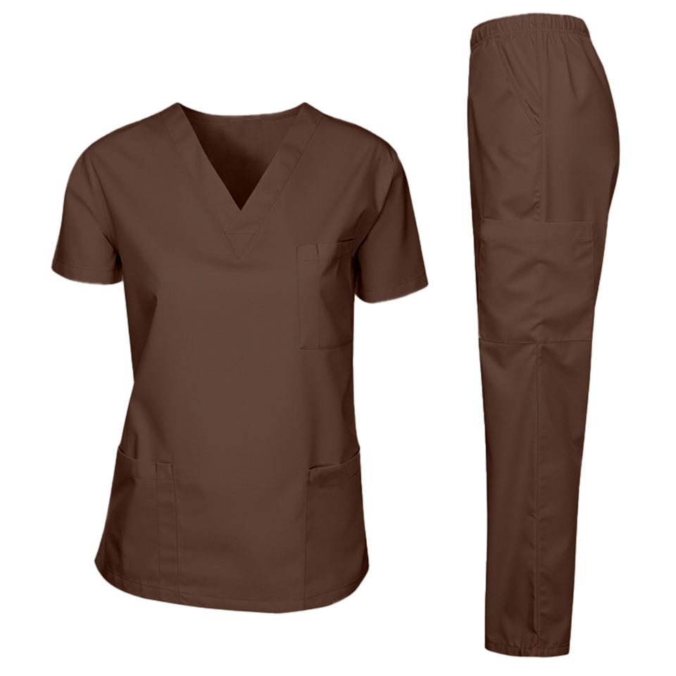 Ensemble de blouses médicales unisexe marron foncé en tissu Oxford premium, respirant, avec fente latérale, haut et pantalon, détection des aiguilles, confort