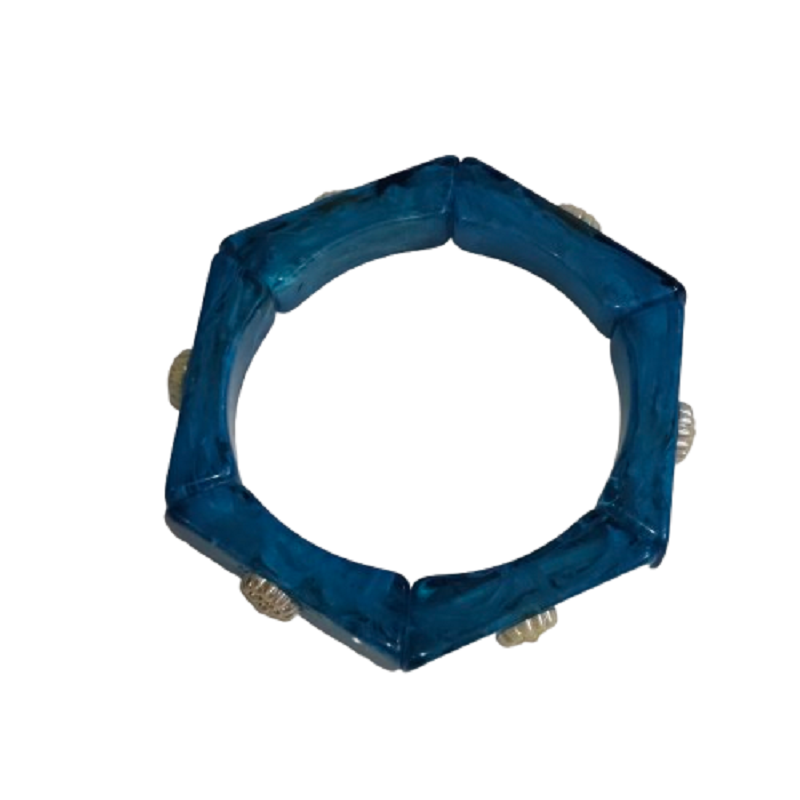 Bracelet extensible segmenté marbré bleu océan profond avec rivets floraux argentés complexes – Bijou élégant en résine polie à la main