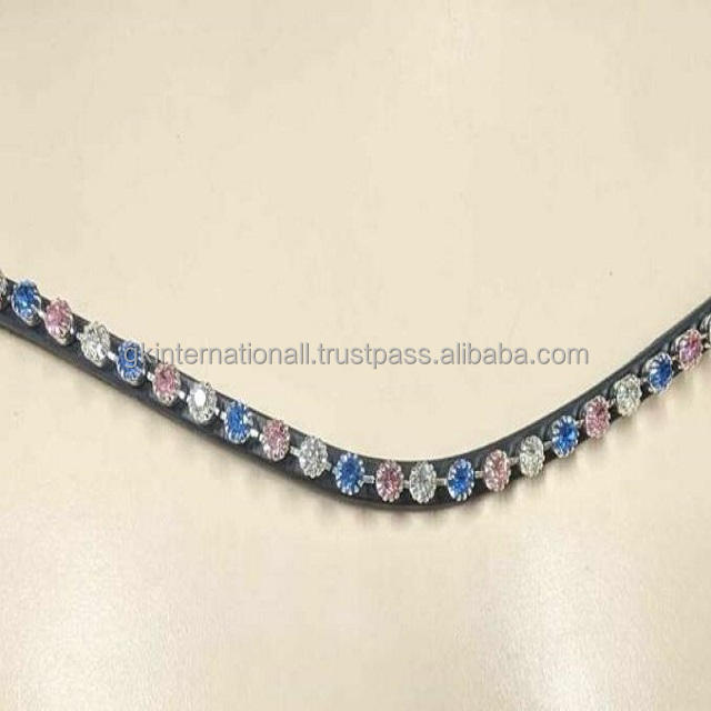 Bande de front de cheval en cuir véritable en forme de vague profonde personnalisée avec des cristaux ronds de marque multicolores strass chaîne bling