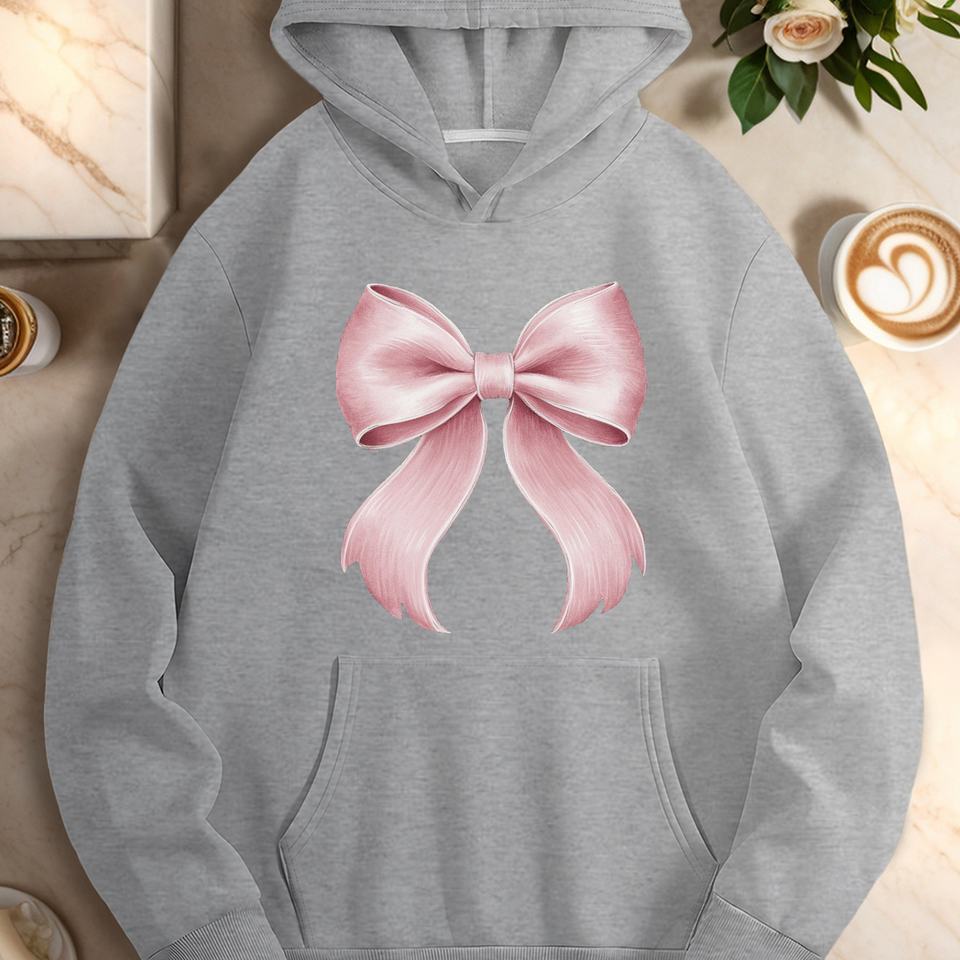 Delicate Pink Bow Women's Casual Hoodies Printed Knitted Fabric Hooded Collar