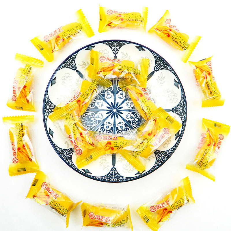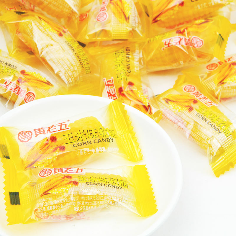 Saveur de maïs délicieux bonbon sucré gommeux goût fruité nourriture avec emballage transparent joli motif de bloc emballé dans une boîte sac fait sucre