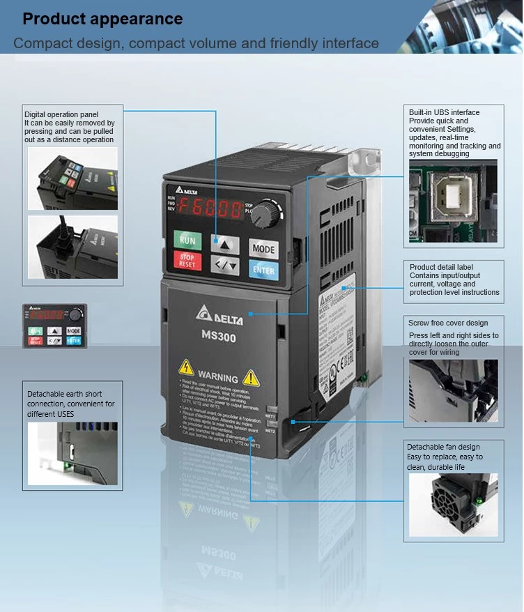 Variateur de fréquence Delta 1HP 460V 0,75kW triphasé compact pour machine d'emballage et petit souffleur