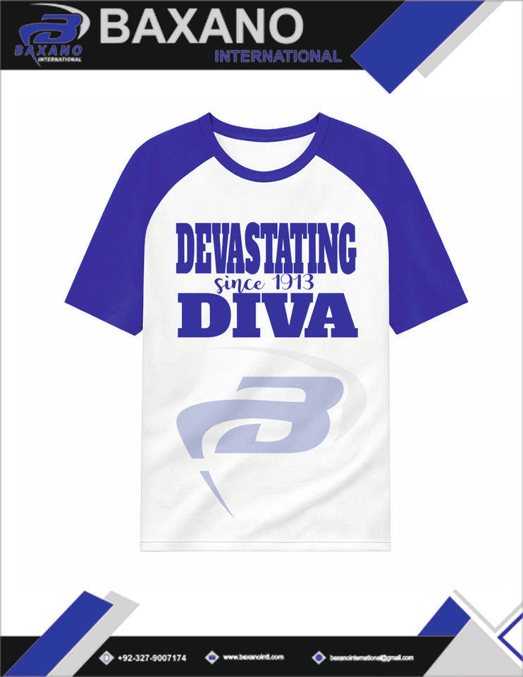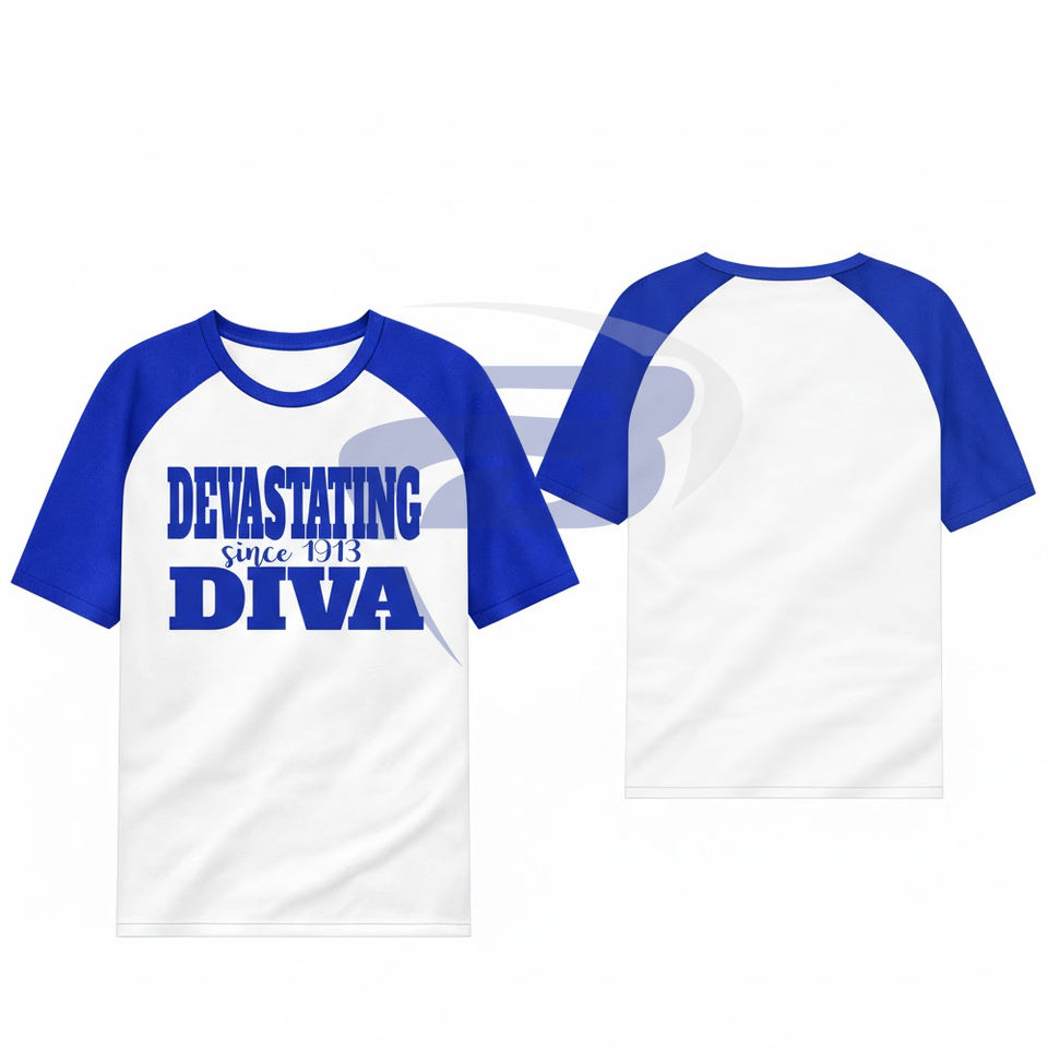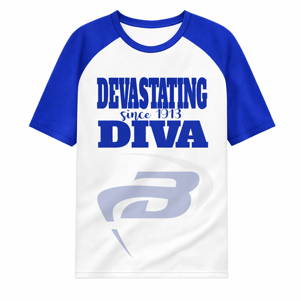 Delta | Sigma | T-shirt décontracté à manches raglan Theta Sorority avec broderie « Devastating Diva » – T-shirt Sorority DST