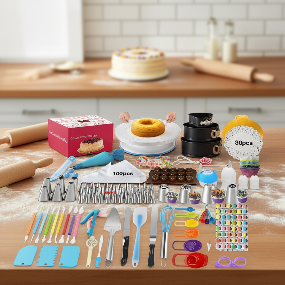 Ensemble de décoration de gâteaux de luxe 390 pièces, plateau tournant en acier inoxydable avec 48 embouts pour la pâtisserie et l'art culinaire