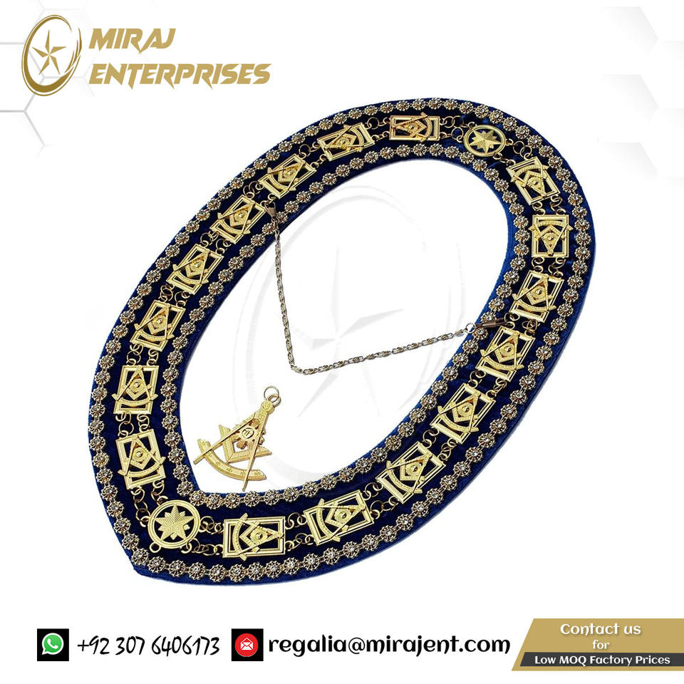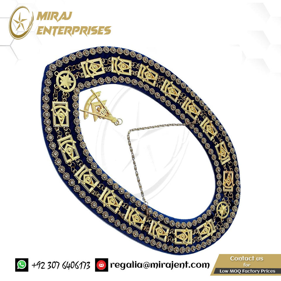 Deluxe Rhinestone Blue Backing Master Masonic Gold Collar avec Jewel Chain Collar Gold G Plated Metal