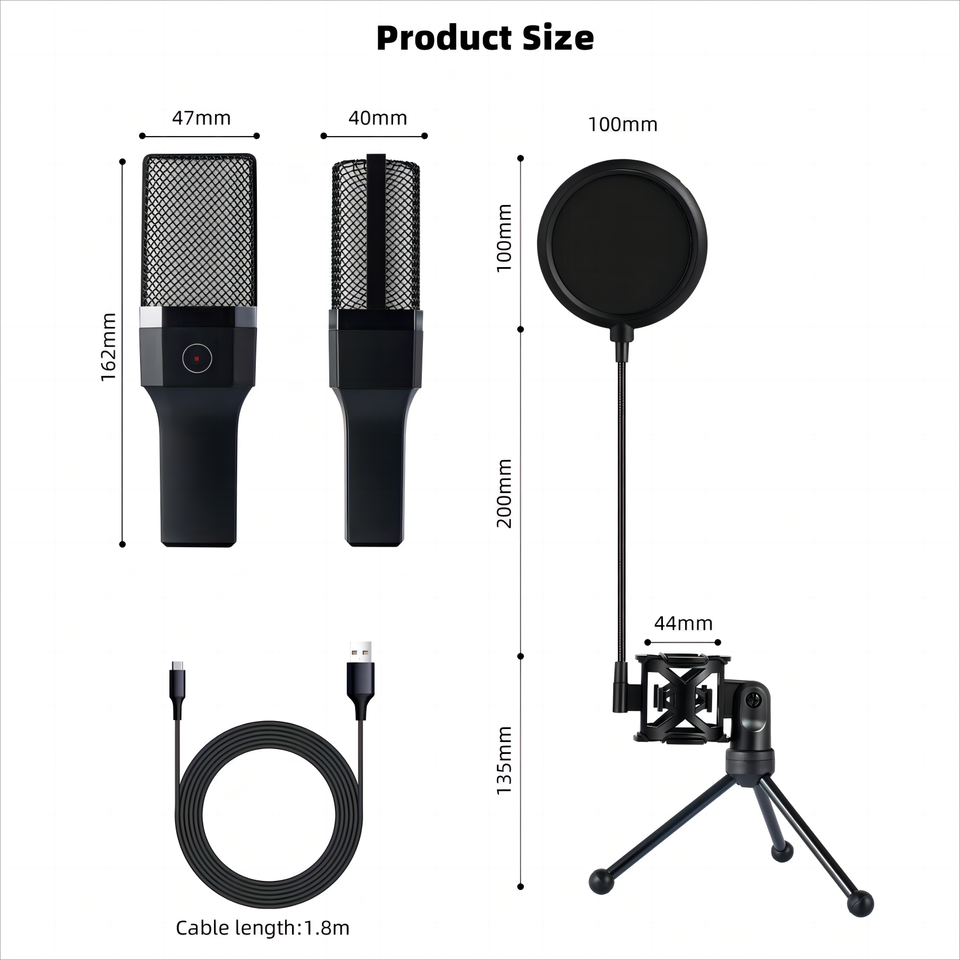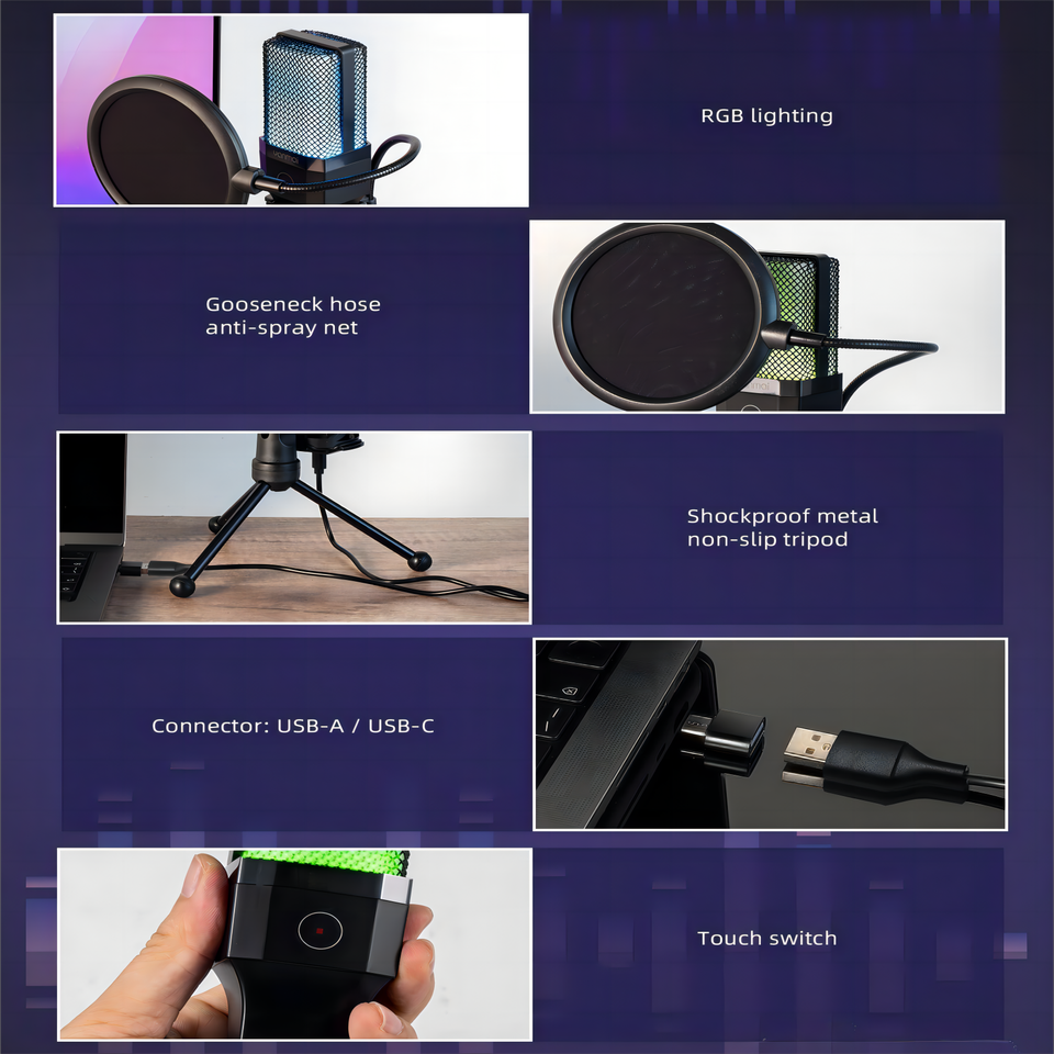 Micro USB, Avec LED lumières, Avec éclairage RVB, Microphone à condensateur, Léger, Réduction de bruitFonction