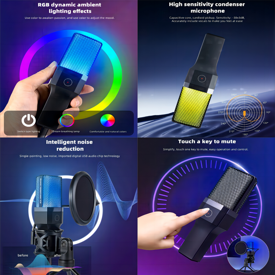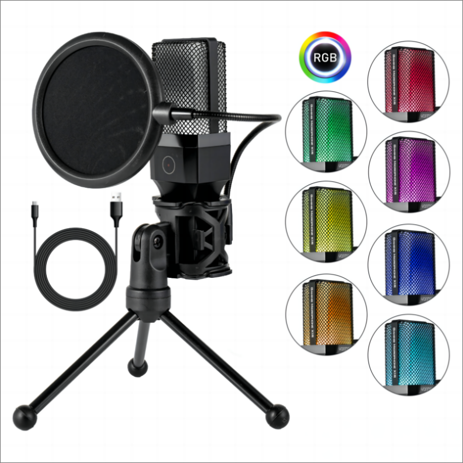Micro USB, Avec LED lumières, Avec éclairage RVB, Microphone à condensateur, Léger, Réduction de bruit