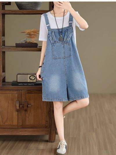 Denim de haute qualité salopette courte pour femmes lavage léger en détresse Vintage Style sans effort bavoir ensemble bouton imprimé à la mode
