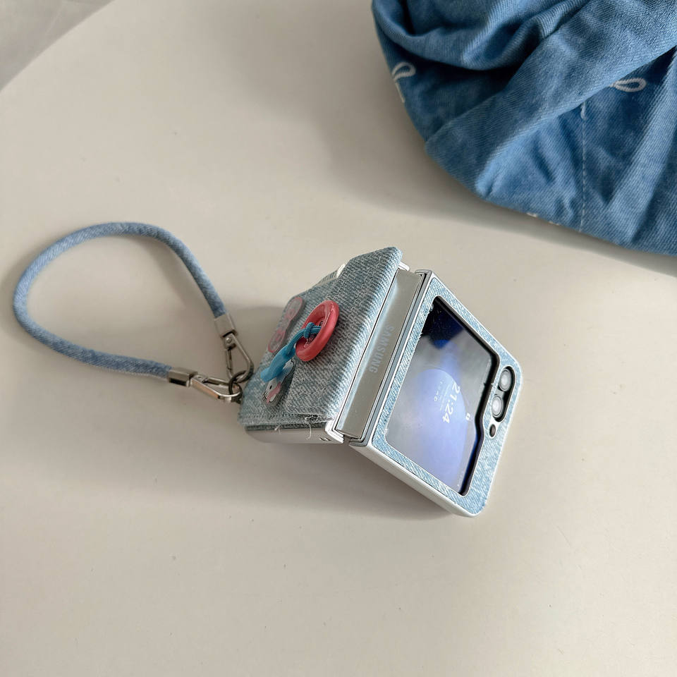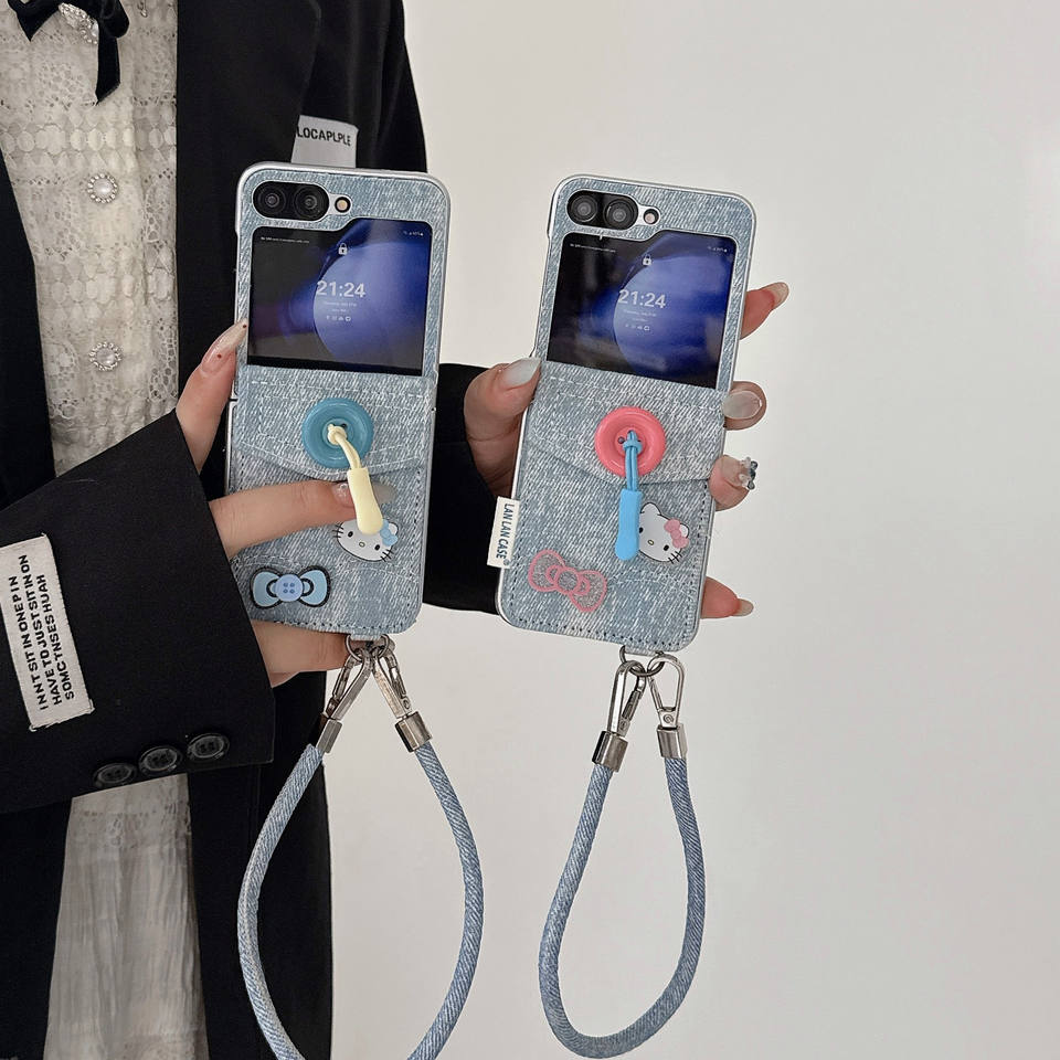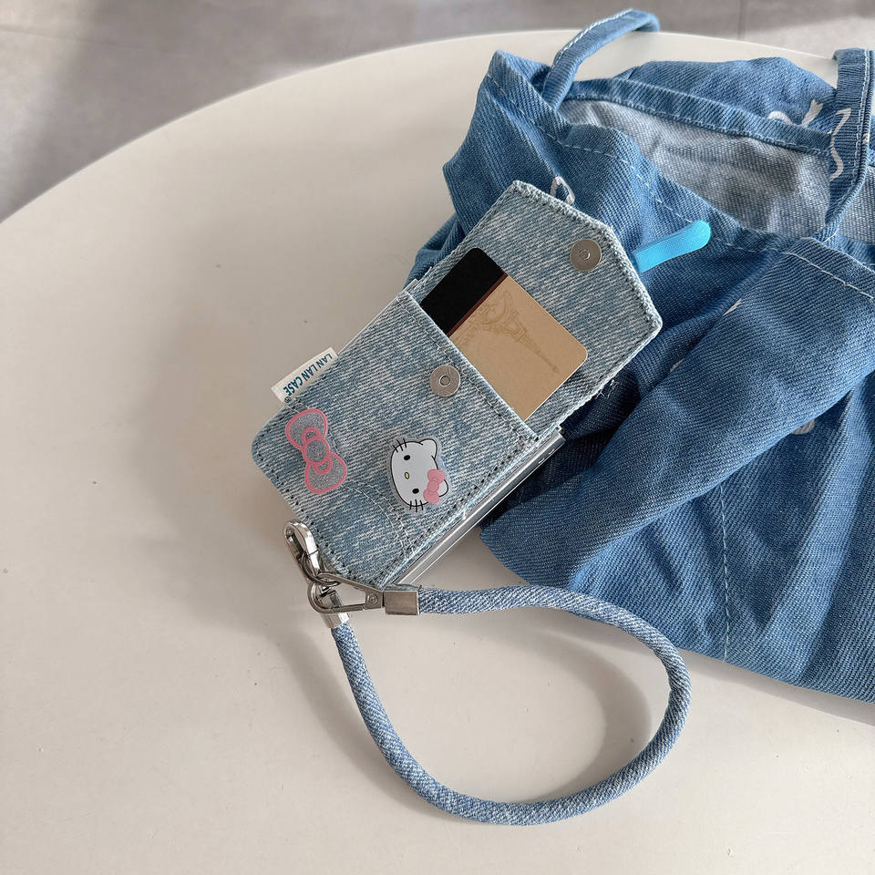Coque de téléphone Denim Kitty Cat avec poche pour carte et dragonne pour Samsung Z Flip 7/6/5/4/3, housse de protection anti-chute mignonne