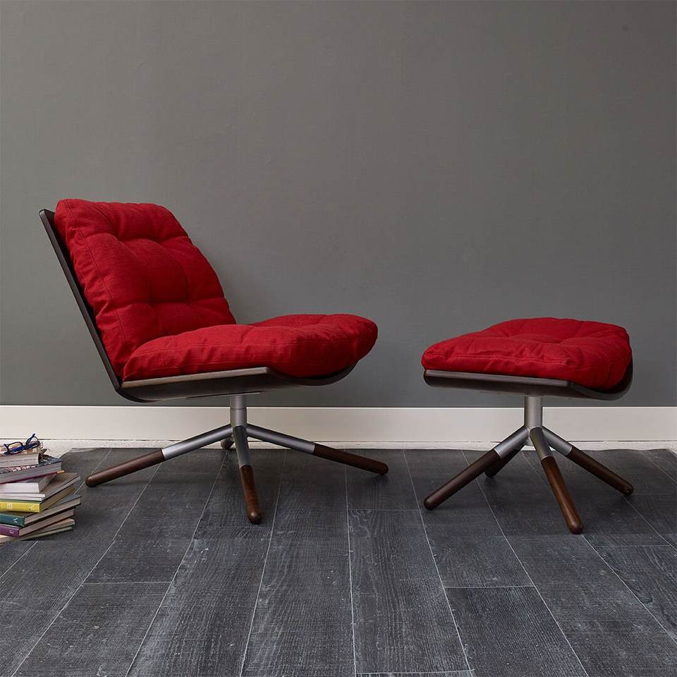 Fauteuil individuel moderne et élégant avec fonction pivotante, Denis Berjer, en bois de noyer et revêtement en tissu rouge