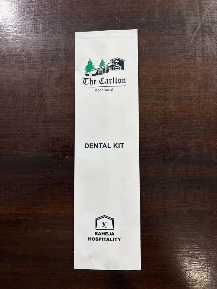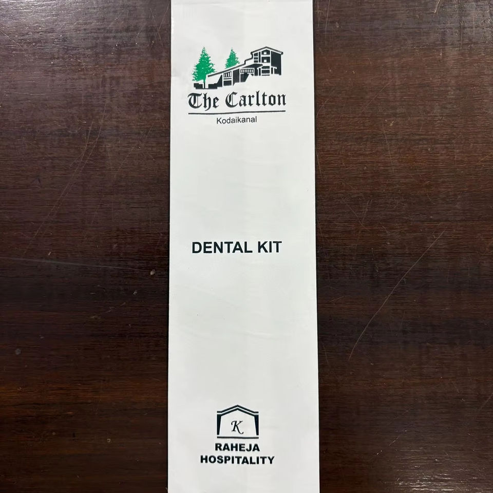 Kit dentaire vide en papier sulfurisé transparent, impression bicolore, pochette thermoscellée à soudure centrale, pour produits d'accueil hôteliers (éclaircissant et contrôle du sébum)