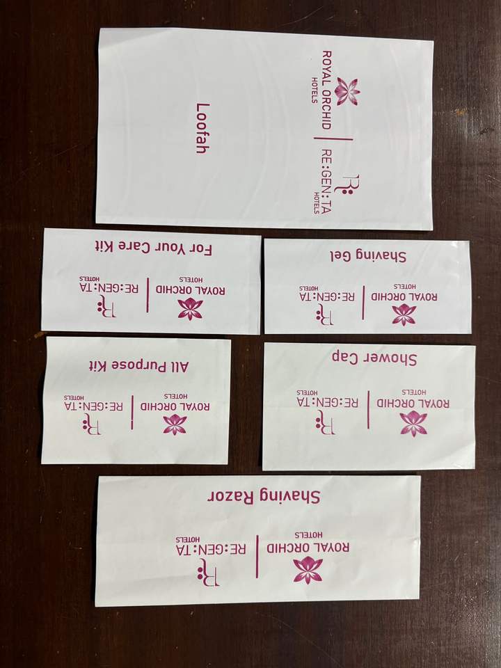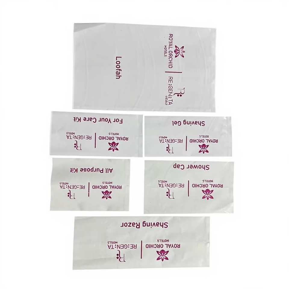 Kit dentaire mini biodégradable et respirant, pochette thermoscellée en papier chromo à impression bicolore, scellage central, pour articles de toilette hôteliers