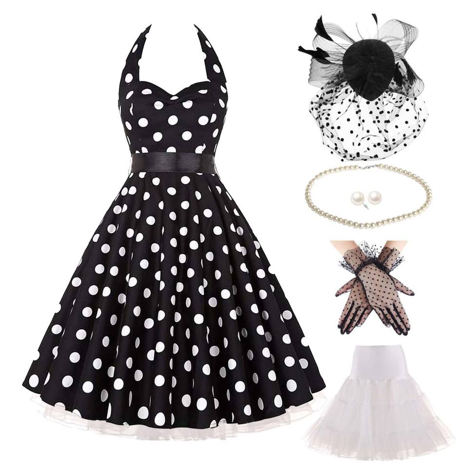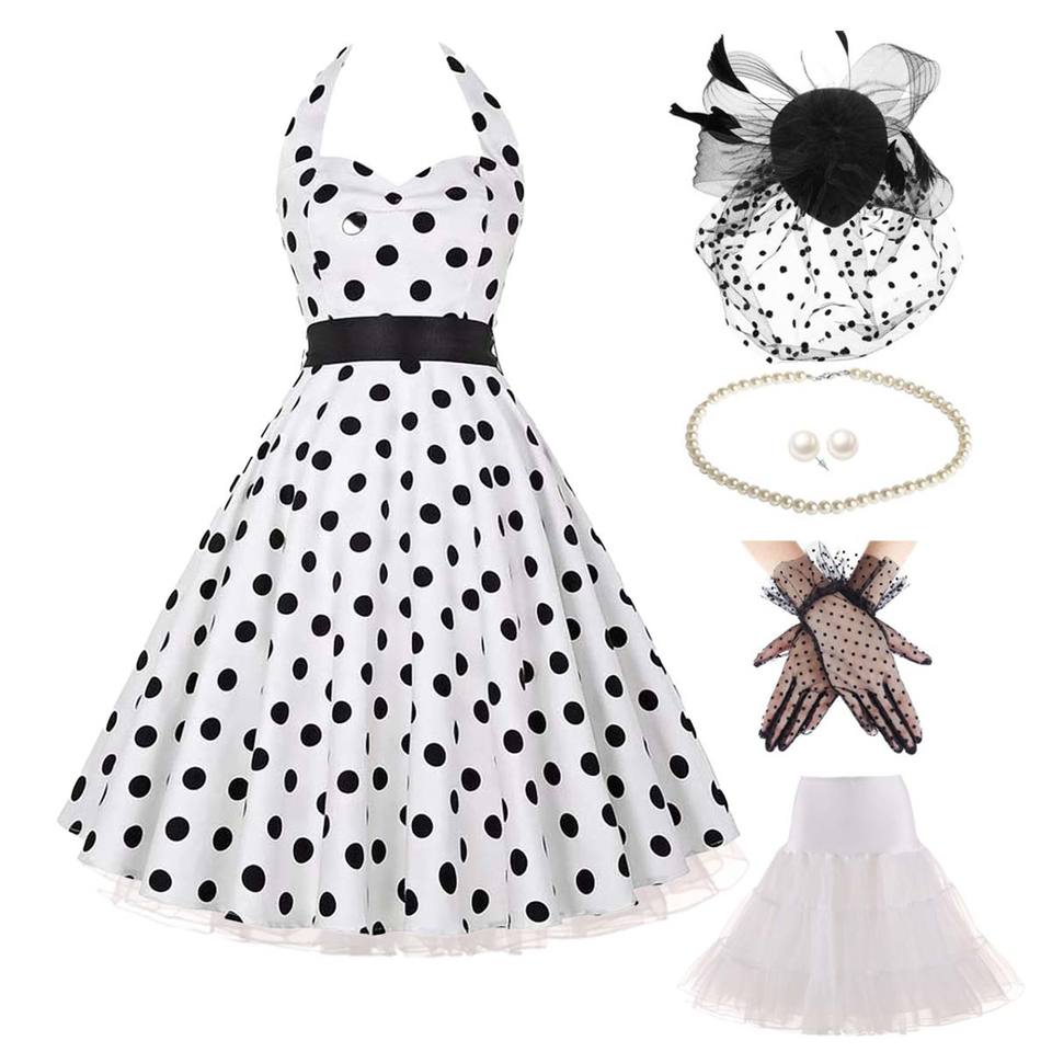Derby Tea Party 6 pièces femmes Vintage à pois rétro robe crayon Costume avec accessoires YTHC-010
