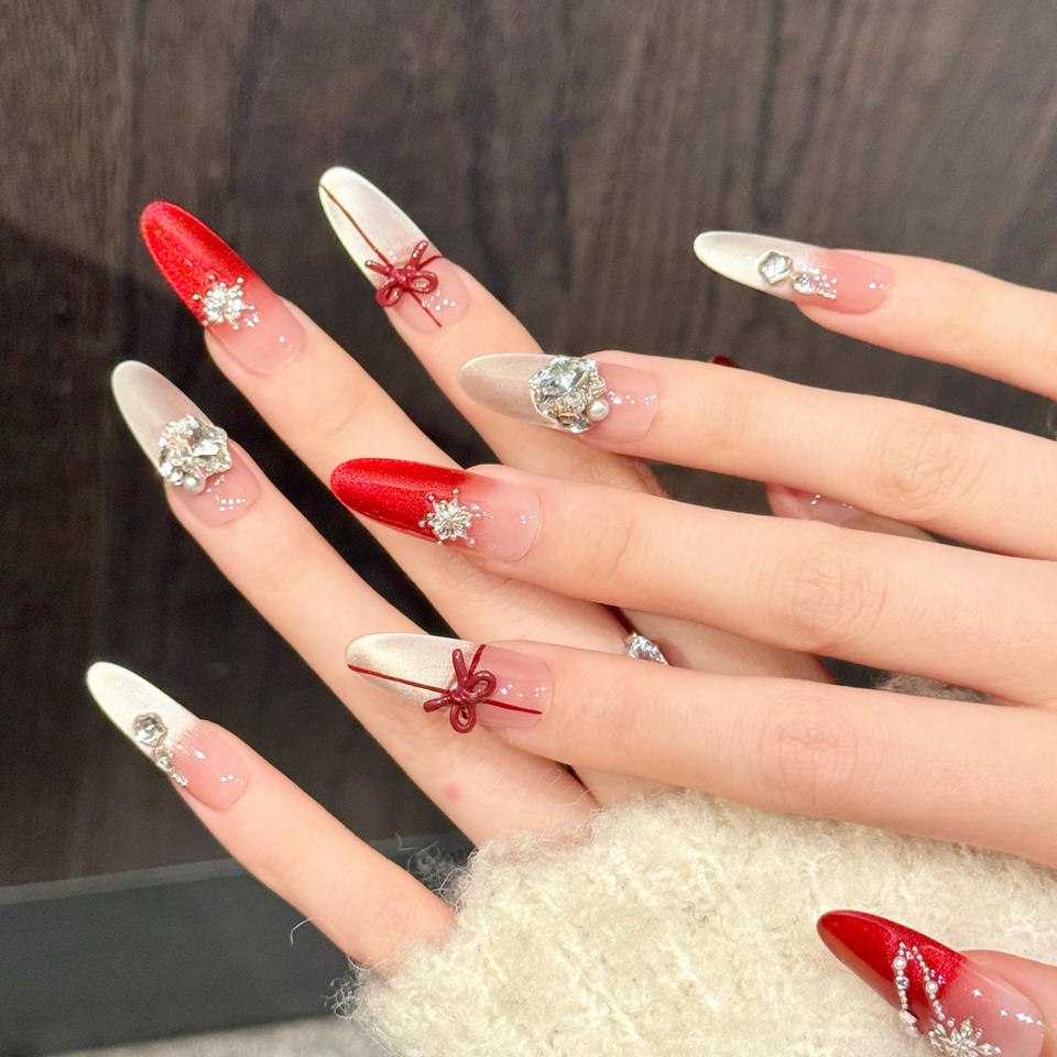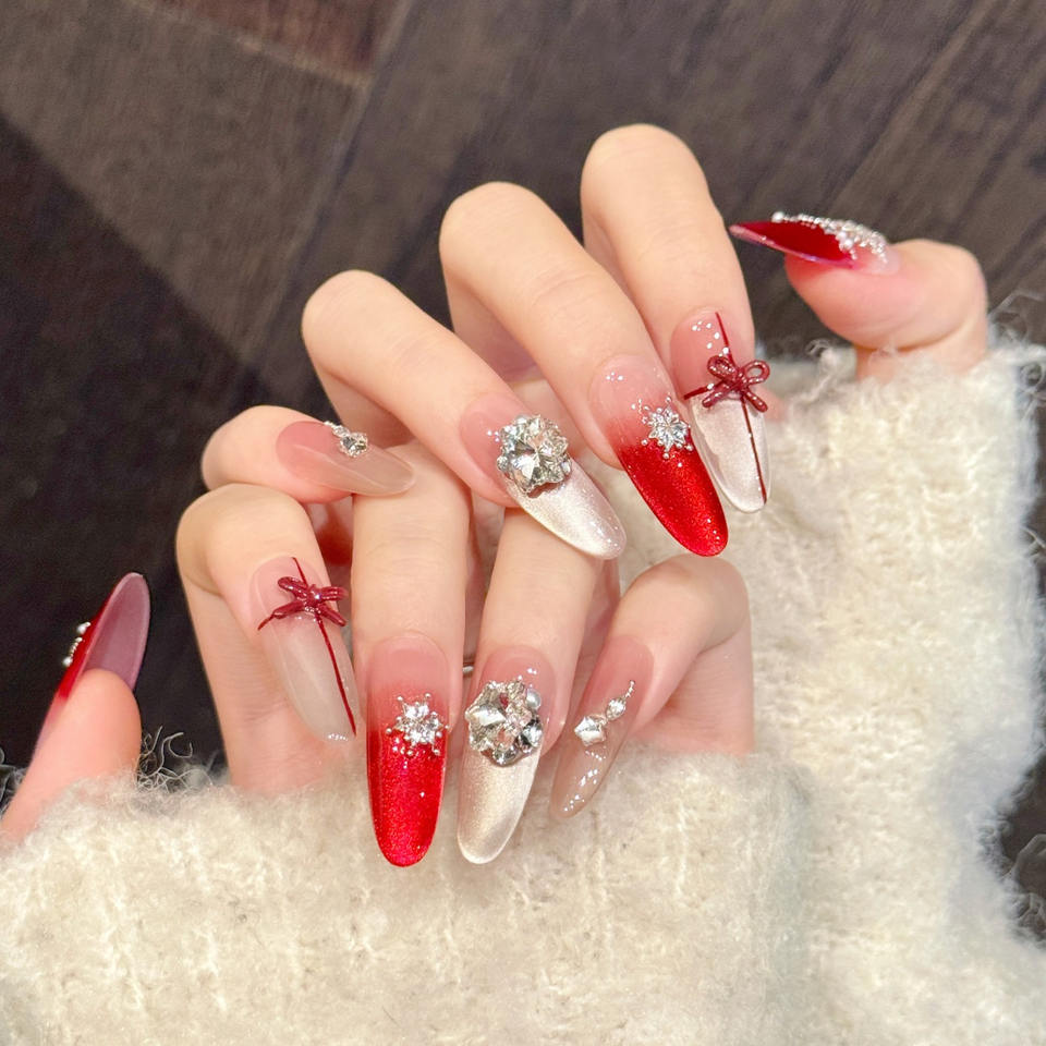 Design # 3449 Faux ongles de luxe œil de chat rouge de haute qualité, réutilisables, à presser, faits à la main, avec strass 3D, pour manucure