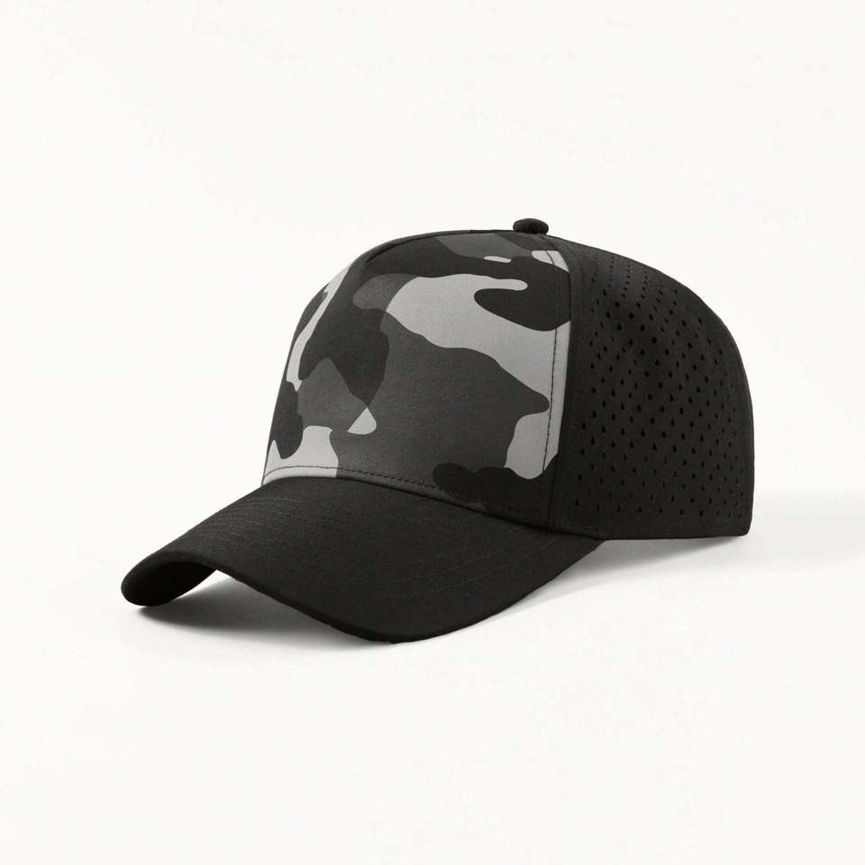 Casquette de sport noire personnalisée à 5 panneaux avec visière, coupe classique, haut de gamme, en mousse et maille, style trucker