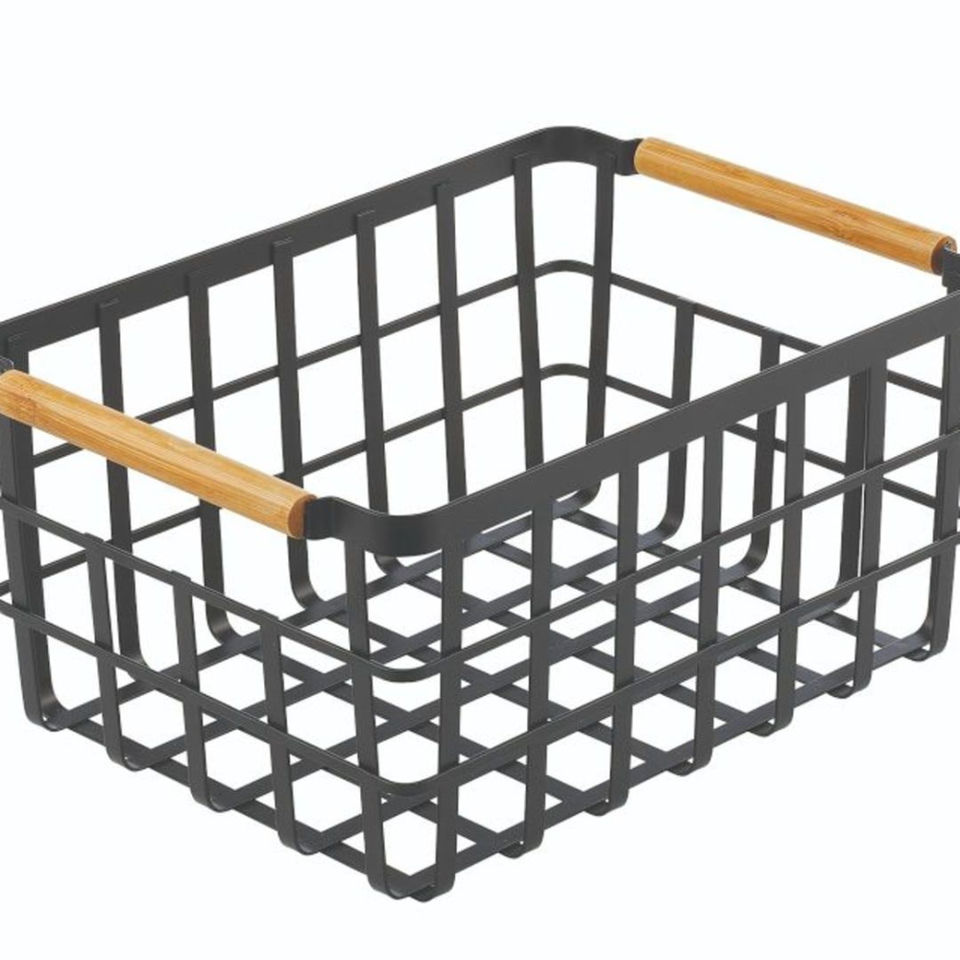Panier de rangement en fil métallique pour la cuisine, style ferme, avec poignées en bambou, pour le rangement des aliments, des fruits, finition noire