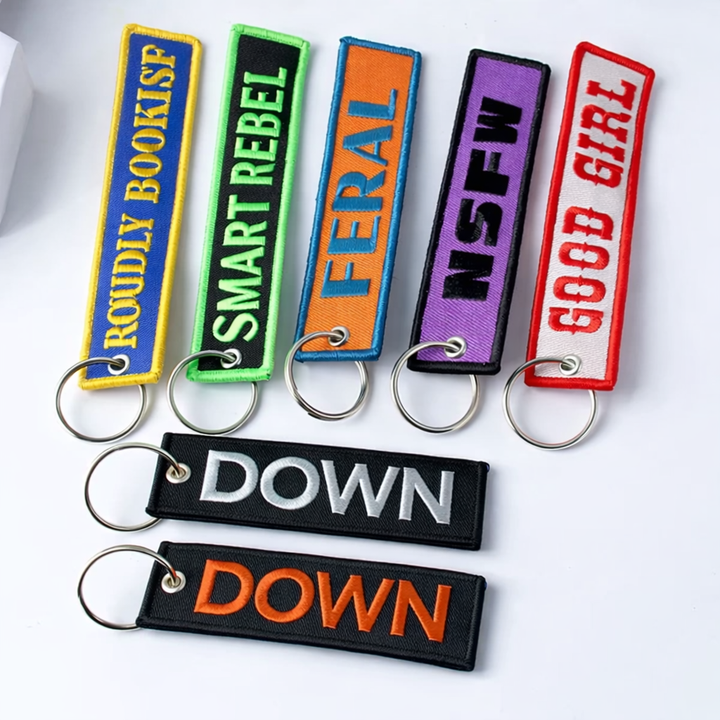 Porte-clés brodé 3D sur le thème de la liberté de conception, avec logo de marque, lettre d'équipage et jet tag, personnalisable pour promotion