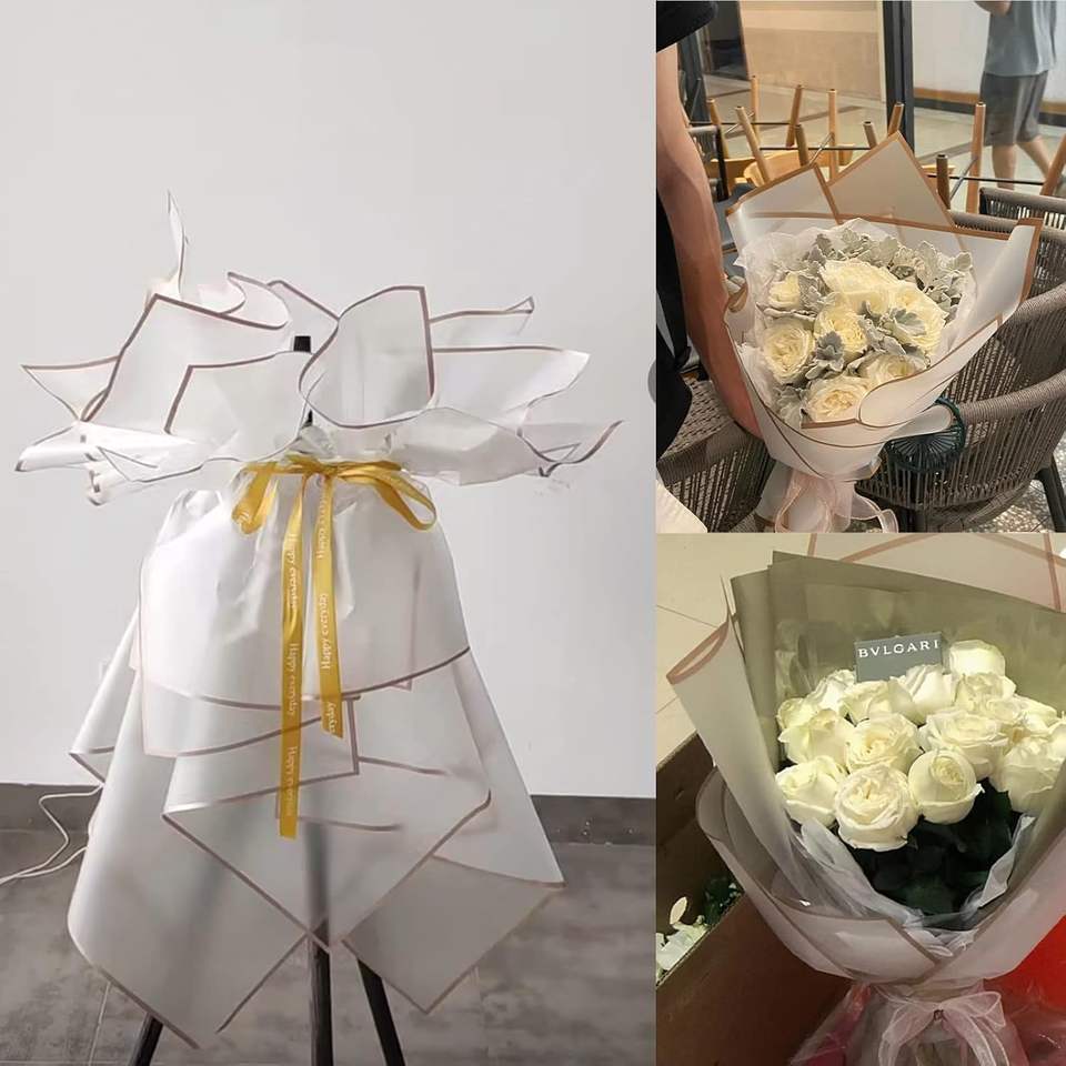 Papier d'emballage pour fleurs personnalisé, design bord doré, en plastique imperméable, pour bouquets, vente en gros